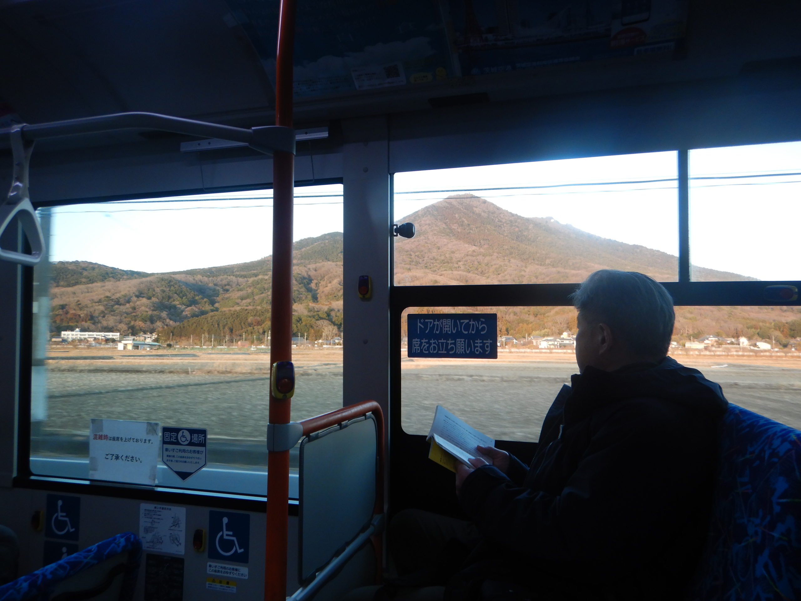 バスの中から風車が見えると、歩いて来た道を振り返り話す。西の空は夕焼け空になっていた。