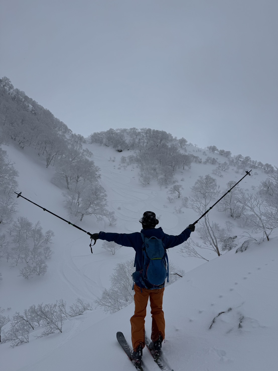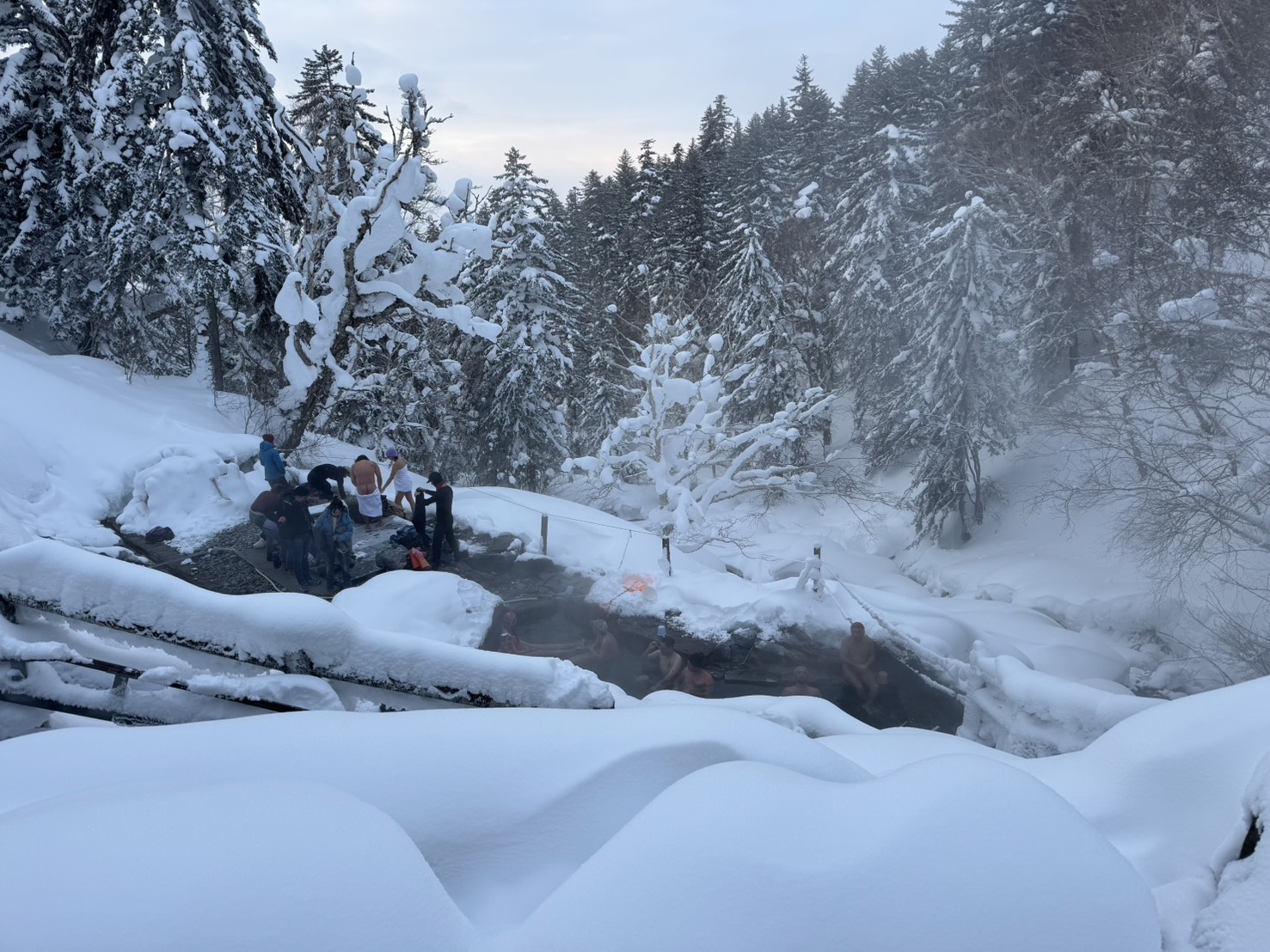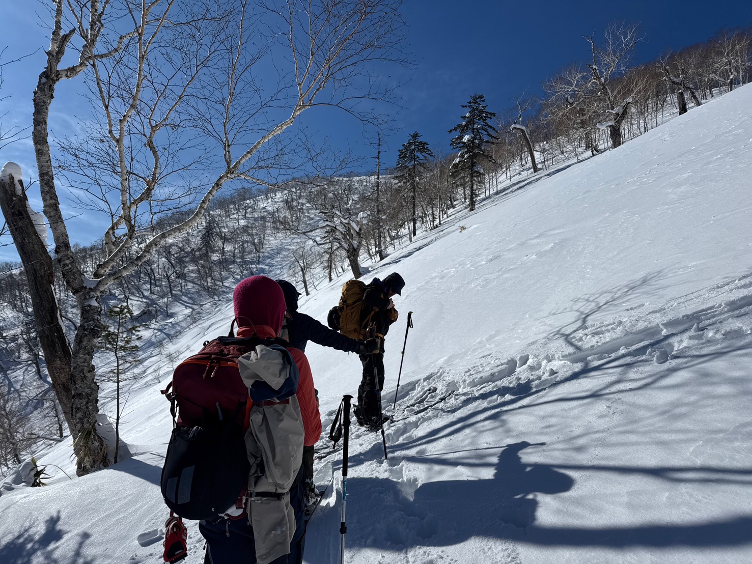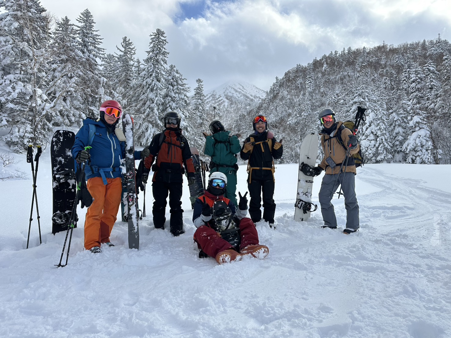 <9日>本日は白銀荘の近く翁公園から沢に降りて1時間30分ほどハイクアップ1300メートルからドロップデイープパウダーでした。無事下山して吹上温泉で国際親善をしてきました。
