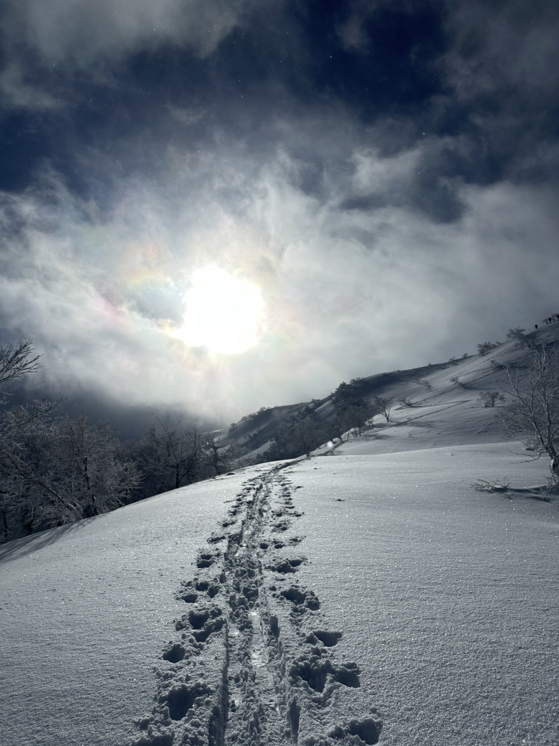 <8日>富良野バックカントリーガイドツアータケノコ山無事下山しました南富良野道の駅でマイナス25度という過酷な条件でハイクアップ3時間3本のロングコース滑りました 強風でパックされた雪に苦労しましたがパウダーもあり楽しめました明日は富良野岳に挑戦します