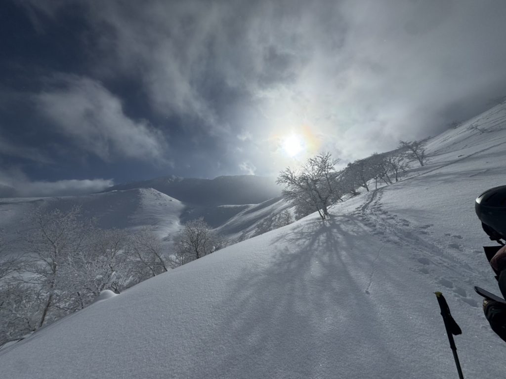 本日十勝岳は三段山バックカントリー単独です。8時スタート昨日の強風のせいかオープン斜面は雪が少なくシュカブラになっていて滑りにくい。山頂はガスがかかっていて断念1600メートル辺りでドロップ。雪の良い谷や樹林帯を選んで12時に無事下山しました。流石にー16度なので少しのパウダーでも良く走る雪で楽しめました。