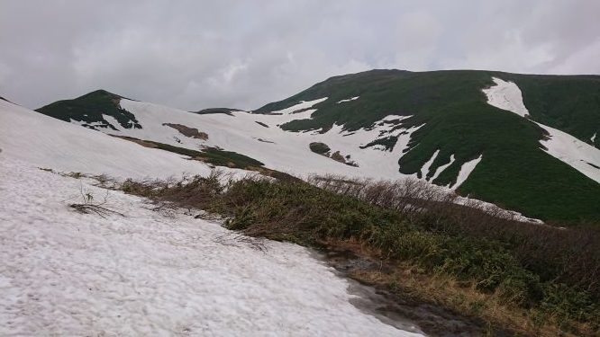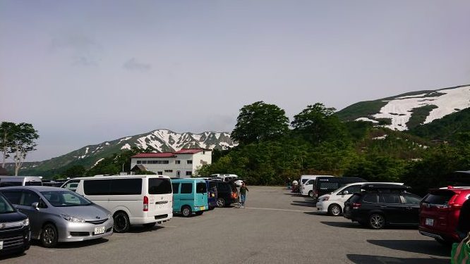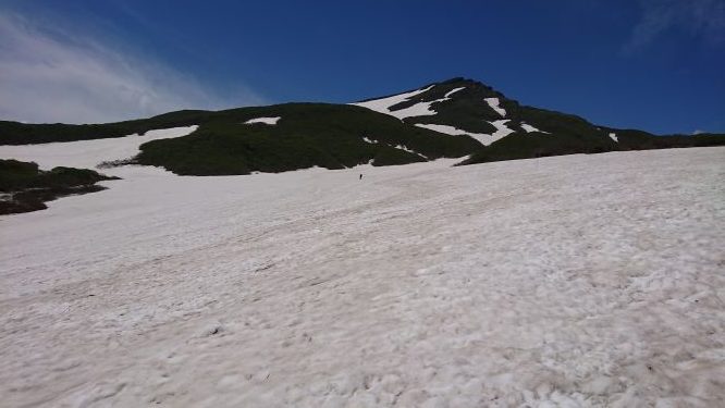 前泊した志津温泉からスキー客でにぎわう姥沢駐車場へ移動。天気は曇りですがガスもなくまずまずの感じ、山スキー(わたなべ、おちあい)、ツボ足(たむら)で登山。リフト上駅へ到着後、一旦沢側へ降りてから牛首先の雪渓の終わり地点で、スキーをデポしトレランシューズに履き替え山頂へ行く。