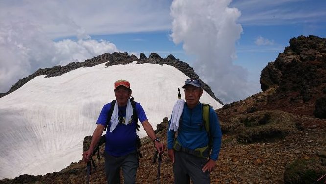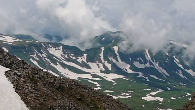 秡川神社を通過すると雪があらわれましたが、賽の河原付近で一旦雪がきれ、その後、舎利坂までは大雪渓の中を天気に恵まれ快適に登りました。浮石の多いきつい舎利坂の登り、外輪の七高山へ立ちました。疲れと帰りの時間を考えて、目前の新山へ登行は止めここで打切りました。天気に恵まれ展望を楽しむことができました。下山は、広大な残雪の斜面を快適に降りられました。