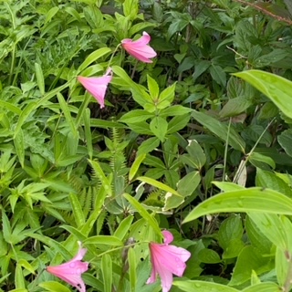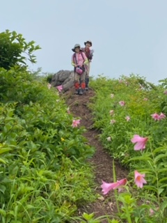 ここから、このコースの最初のヒメサユリの群落です。可憐なヒメサユリに感激し、可憐な姿をそれぞれカメラに収めました。花の群落は、昨年に比べると少ないような気がしました。蕾も多いので、見頃はこれからかもしれません。ここから鬼ヶ面山までは登山道は狭く、場所により山肌が崩れ危険なので慎重に歩きました。鬼が面山までの途中、下山する人と先行者の4名とすれ違いました。