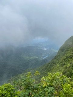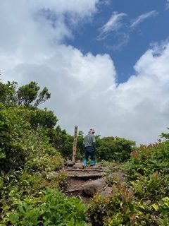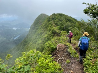 南岳に来るとようやく視界が開け、鬼ヶ面山方面の稜線の緑の山肌に薄ピンクの鮮やかなヒメサユリが見え始めた。南岳で小休止し、目的のヒメサユリの咲く稜線に向かう。昨年来た時は、南岳から稜線に下る数メートルが崩壊していた為、怖いながらも慎重に下ったが、今回この場所は補強されていたので、怖さはなかった。