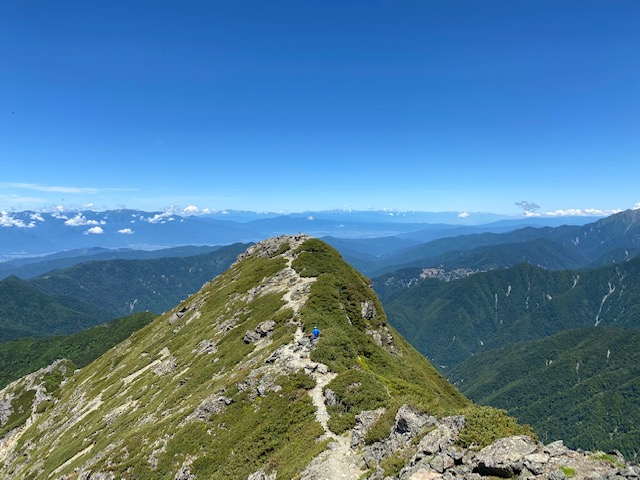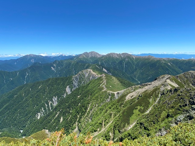 浅い眠りのまま4時となったので起きてパンをかじり歯を磨き、いよいよ出発。その頃には明るくなっており、ヘッドライトはいらない。40分くらい歩いてようやく登山口に。すでに多数のミニベロなどの自転車がくくり付けられており、自転車の威力を知った。そこであった人が靴に何か塗っているので、なんですかと聞くと、ヒル除けとにことで、少し分て塗らせていただいた。そこから三伏峠まではほとんど見通しのない樹林帯の登りで、まだ涼しいので順調に進む。三伏峠小屋に到着し、テント場に行くと、10張以上はあり、昨日から残っているものの他に張っている人もいた。食事をしてテントを設営し、8時に出発。ここから塩見岳の取り付きまでがうんざりするくらい長い。しかも見通しはたまにしかきかない。最下降点よりいよいよ塩見岳の登り、急登で岩場が出てきて、偽ピークに騙されつつ諦めないで登るとようやく西峰にたどりついた。途中途中黄色、白、紫の花を見かけるも例によって全く名前は知らない。すぐに東峰に向かう。今年最初の3000メートル峰だ。360度の大パノラマがひろがっていた。富士山、白い山頂が特徴的な甲斐駒ヶ岳、仙丈ヶ岳、北岳、長大な仙塩尾根がこちらに向かい、遠方には槍ヶ岳などの北アルプス、そして剱岳までみえる。登山者はどの顔も充実しており、なかには熊の平小屋から蝙蝠岳をピストンして塩見岳にきて、また熊の平小屋に帰るというおばさんの強者がいた。すごいですねえというと、嬉しそうにたくさん話だしたので、うぜえなあとすぐその場を離れた。ここからの三伏峠まで何気のアップダウンが足にくる。後ろから20メートルくらい離れてピタッとついてくる、10〜20代の若者に負けるものかとスピードを落とさずにしたが、三伏山でいい加減意地をはらずに抜かさせた。テント場はすでに完全にうまっていた。水場までが往復25分もかかるのでこれはイマイチだった。そして小屋で売っているビールは冷やされていないで600円は高い。200グラムのステーキ肉を持っていったので、これを塩胡椒でガンガン焼いていると近くの人々から「いいにおいがしね?」と呟きが聞こえる。どうだと、ジュージュー言わせながら喰らう。それから小渕沢のレストランで作られている水400mlと一緒に沸騰させて15分待つと素晴らしいパスタのできあがり。山の道具屋で1000円以上するが、食う価値あり。ウイスキーを飲みつつ、一旦はやはりルネスタ2mg内服し18時に寝てしまうが、また20時頃目が覚めて、それからはうとうとしたり起きたりの繰り返しになった。Au 4Gがぎりぎりはいるので、スマホをいじってみたり、寝返りを打ってみたり、マットがあまりよくないのか、いつもより浅い眠りであった。