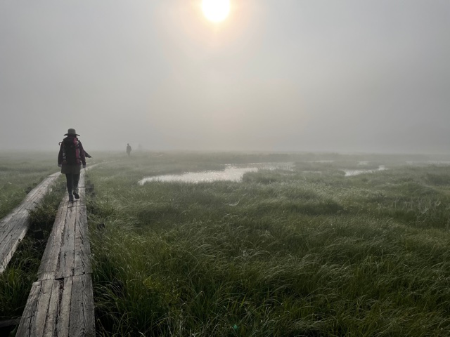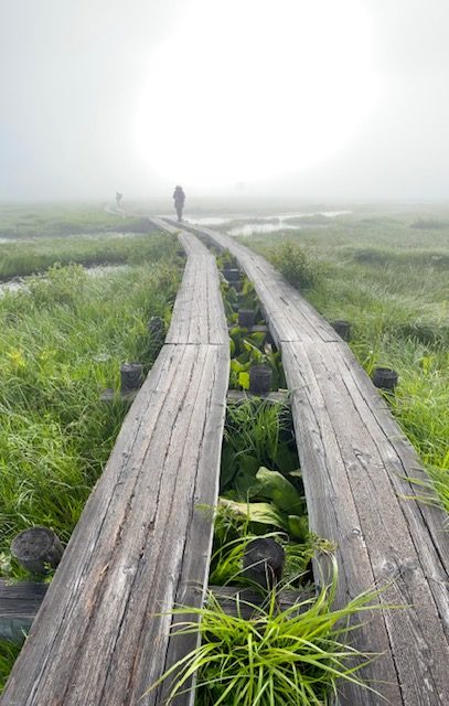 5:30起床、6:00過ぎに山荘を出発、外は霧に包まれ幻想的だ。「霧の中に浮かびくる遥かな尾瀬遠い空」の歌詞を口ずさむ。長く伸びた木道の先の燧ヶ岳はまだまだ顔を出さない。一時間程歩くと至仏山方面に青空が見え始めた。牛首手前のベンチでお弁当を食べた。(梅干、鮭のおにぎり二個、卵焼き、鳥の唐揚げ、漬物)7:30前には霧も消え始め、至仏山が見え8時過ぎには霧はすっかり消えた 木道の先の至仏山も美しい。ヒツジグサの花の開花には時間が早い。この時間になると人とすれ違うようになった。9時過ぎに見晴しに着いた。弥四郎小屋で朝のコーヒーを飲もうと思い楽しみにしていたが、準備中でがっかりした。先月、この小屋に宿泊したことを懐かしく思い出した。