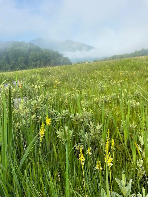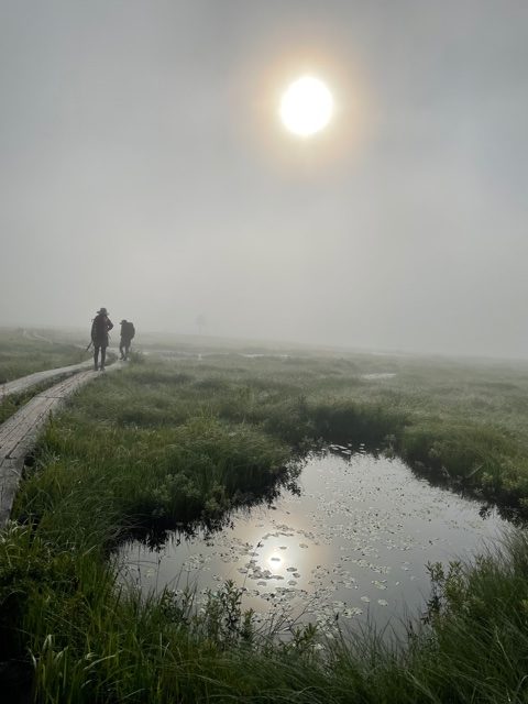 午後15:30過ぎには雨も上がったので、自然園に散策に出かけることにした。山ノ鼻周辺、宿泊施設の周りで熊出没に情報があるとのことで、注意を促された。(至仏山荘を彷徨く熊の写真を見せてくれた)自然園内ではあまり奥に行かないようにし景色を眺めたり、景色や花を写真を撮ったりし楽しんだ。(キンコウカが群生し満開だった)19:30過ぎに再度自然園を散策、夜なので特に注意しながら景色を写真に収めた。部屋のカーテンを開けていたら、外ガラスに蛍が二匹飛んでいた。尾瀬ヶ原で蛍を見たのは始めてだ。翌日は早立ち(6:00)の予定なので、朝食をお弁当に変更しておいた。