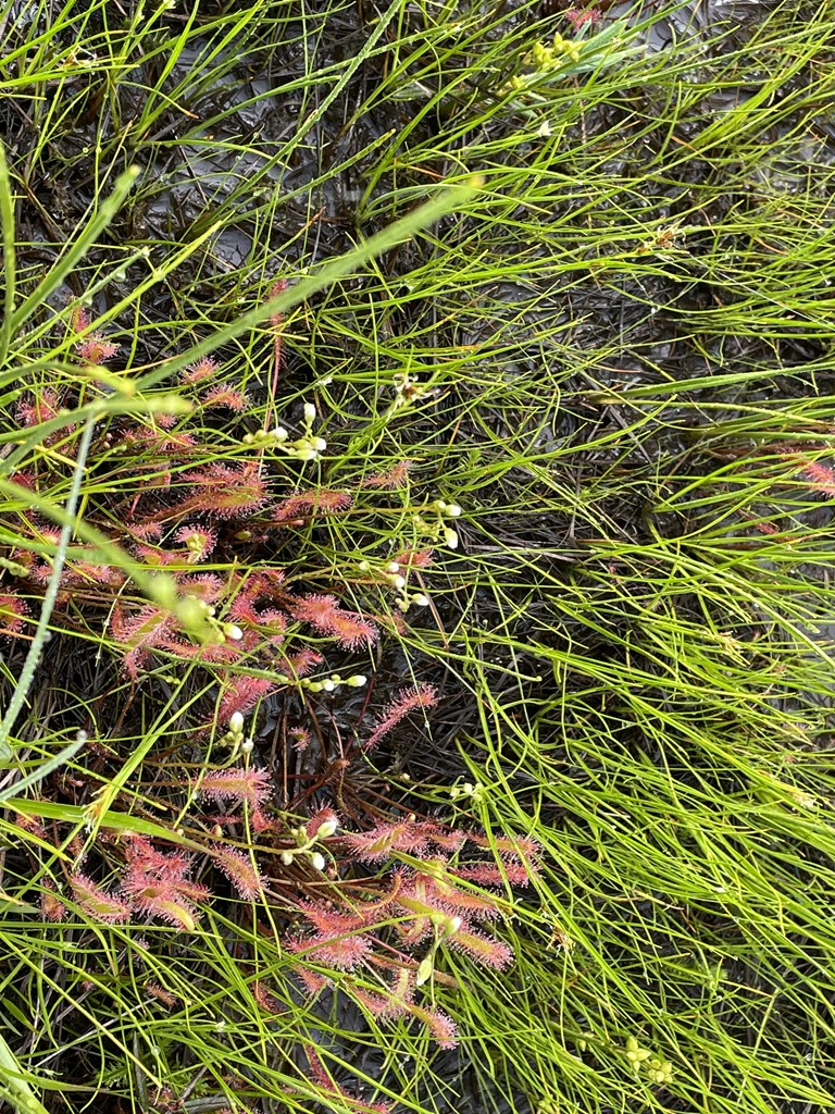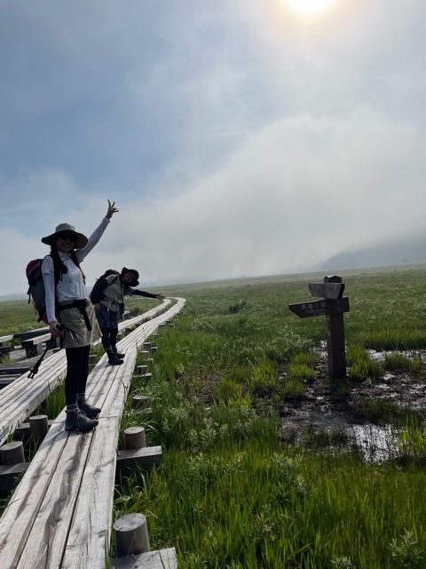 湿原には、ニッコウキスゲ、アザミ、トキソウ、ナガバノモウセンゴケ、サワラン、ヒメシャクナゲ、ワタスゲ・ミズチドリ・キンコウカなどが咲いていた。片品村観光協会広報課の方がドローンを飛ばしていて、尾瀬ヶ原ニッコウキスゲの近況をドローンで撮影し、4連休に向けてユーチューブ動画配信をするとのことだった。