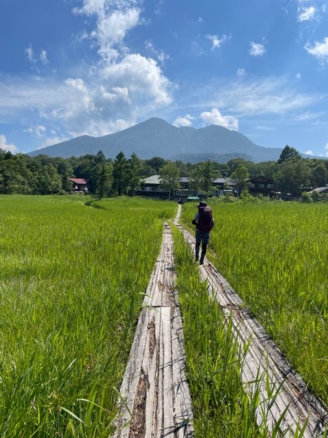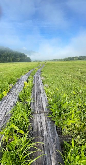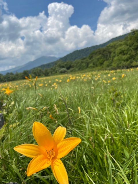 東電分岐を経て東電小屋へ向かう。東電小屋で花豆ソフトクリームを食べ、一杯のコーヒーを三人で分けあって飲んだ(紙コップを二人分頂く、ここの方も親切だった)ヨッピ橋過ぎた辺りからの景色も大変美しい。下の大川橋付近の木道の修理作業が行われていた。ヨッピ橋~牛首間のニッコウキスゲが見頃でした。