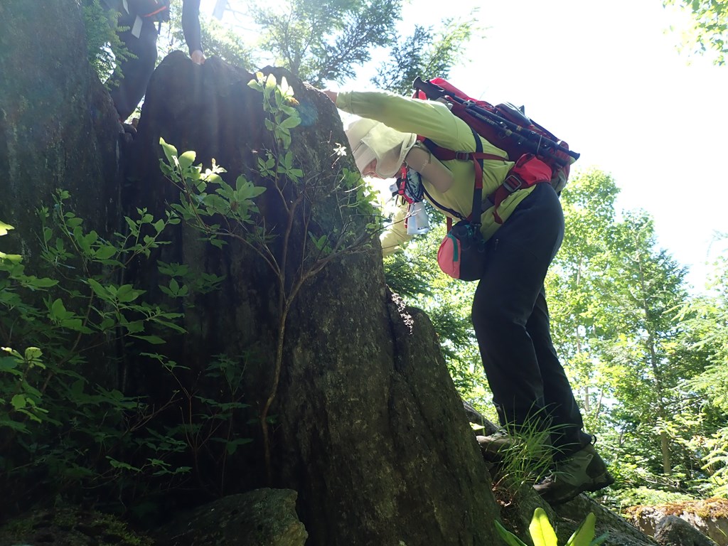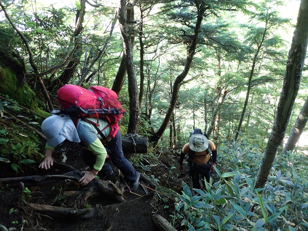 2日目は朝食を弁当にしてもらったので、弁当を食べて、早めに宿を出た。橋を渡ると小さな崩落個所があり、岩屑を踏みしめて超えた。その先にも崩れている箇所があり、これからもまだまだ雨の度に崩れそうな気配だった。その先から急登が始まった。オロオソロシの滝の展望台に着いた時には急登にウンザリし始めていた。昨日は適度に風があったのだが、今日は無風だ。朝まだ早いが樹林帯の登りは蒸し暑い。90分ほど頑張るとやっと傾斜が緩やかになるのだが、登山道が糠っていて歩きづらい。やっと、湿原の南端に着いた。ベンチには日があたっているので、他に誰もいないことを良いことに、日陰になっている木道に腰かけて大休止した。計画では湿原から鬼怒沼山を往復することにしていたが、それを取りやめるという提案に誰も反対しなかった。