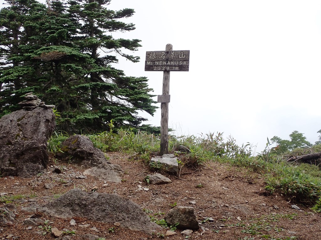 登山口から金精峠への急峻さは相変わらずだ。峠に着いて一休み。快晴の青空に金精山が映えていた。温泉ヶ岳分岐で休んでいると単独男性が温泉ヶ岳へ登って行った。我々は真っすぐ念仏平を目指す。比較的歩きやすい山道が続くが、念仏平が近づくと倒木や山道の崩落もでてくる。旧避難小屋近くの水場で休んでいると、先ほどの男性に追い越された。避難小屋で大休止。たっぷりとエネルギー補給。その先にバイケイソウの群落があった。ヨコシマTシャツの男性と行き交い、その先で根名草山で折り返してきた先ほどの男性に会った。「天気が悪くなりそうなので早めに下山します」という。根名草山に到着すると、雲がわいてきて、青空は狭くなっていた。我々も下山を急ぐことにする。