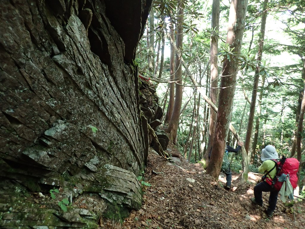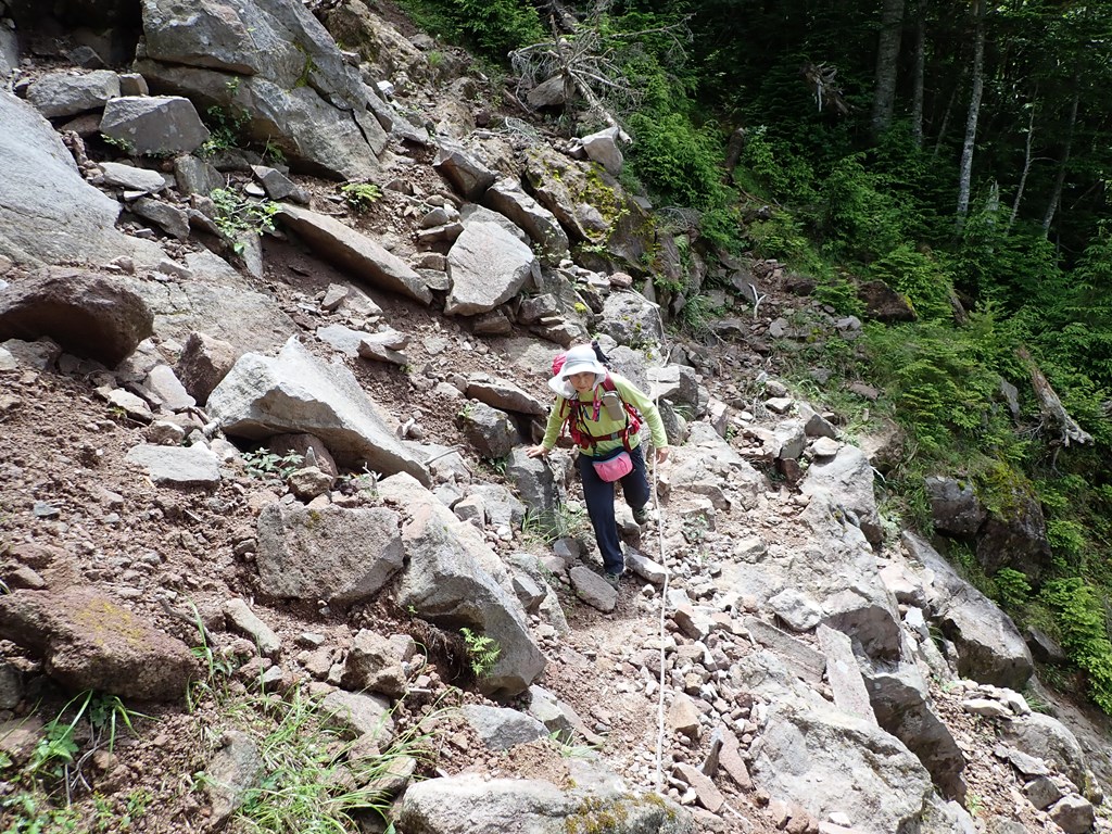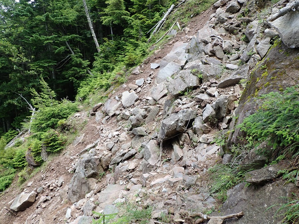その先は私にとって初めて歩くコースだ。情報では崩落個所が3箇所あるという。最近の大雨で酷くなっていないか心配していたが、難なく通過できた。ただ、3箇所とも上部には不安定な岩がたくさん見られて、地震が起きないことを願いながら急いだ。手白沢への分岐からは急な下りが続く。下りながら今回の山行をピストンから縦走に変更して良かったと思った。今回の登山道は迷うような箇所は無かったのだが、終了直前に迷った。スマホで確認して、少し戻り、ワラビ畑に隠れていた踏み跡を辿ると日光沢温泉の上にでた。