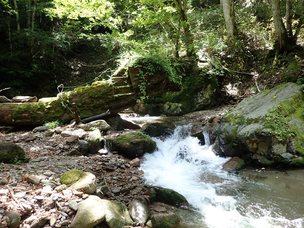 川上には滝がある。かつては大木を使った木橋で渡れたらしいが、今はその木橋が使えなくなって渡渉するしかない。「くりさん」は滝の写真を撮りに行ってそのまま渡渉してしまった。だが、左岸は淵になってそのままでは林道に来れず、結局高巻きして林道にやってきた。私はストックでバランスを取って石伝いに渡った。多分男性が投げ込んだと思われる石が動いたので一瞬危なかったが濡れることなく渡れた。渡渉後、一休みして大清水へ向かった。