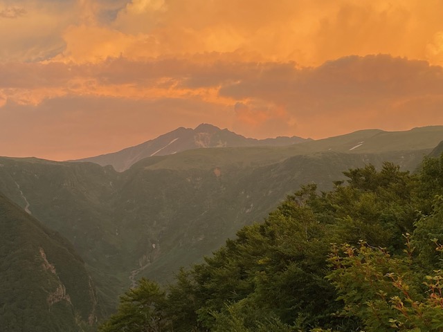 <詳細報告>7月24日7時20分間々田駅出発。宇都宮で乗り換えて山形新幹線で新庄まで行き、ここからディーゼル車で酒田まで。ここは風情のある路線で右に最上川が見え、無人駅がほとんどでいわゆるワンマンカー。車掌に降りる時に整理券と運賃を払う。乗り鉄にはたまらないところだろう。酒田から象潟までは羽越本線で海と風力発電の風車が見える。田舎の海水浴場らしい風景もあり、癒される。象型駅で鉾立山荘に向かうバスを待つ間に定食屋に入り、生の岩牡蠣をいただく。うまい。そして魚介の天ぷらの天丼、これがまたうまい。ローソンで山荘で食べる夕食と次の日の行動食を買い、山荘へ。山荘はテレビのあるロビーと電子レンジまでついている台所、シャワー室まであり、なんと1800円プラス布団代500円プラスシャワー代200円、合計2500円で北アルプスのテン場の値段と同じ金額。しかも4人の部屋に私一人で贅沢に使わせてもらえるという。シャワーをあび、テレビでオリンピック見ながらウイスキーを飲んで21時には就寝。