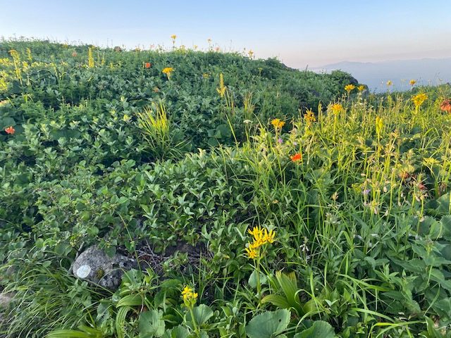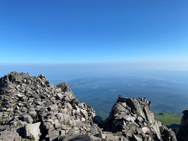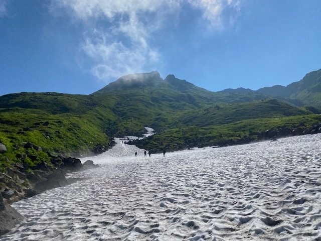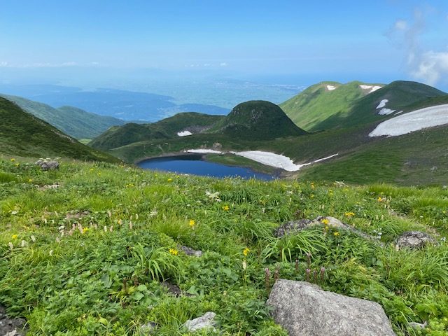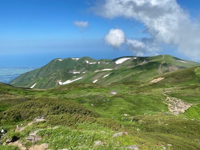 7月25日4時に登山口を出発。月明かりが明るく、ヘッドライトが要らないくらい。コンクリートの階段が続き、その後も石畳ができており、よく整備された登山道である。どんどん先行者を抜いて1時間くらいで御浜小屋に到着。鳥海湖を眺めながらお花畑を通過し、まず外輪山を巡る。急登が続き文殊岳から伏拝岳、行者岳を通過し、7時に七高山のピークへ。ここから一旦下り新山に行く途中は雪渓のトラバースが少しあるものの、全く危険ではない。小屋の近くを通過し、ここからは少し雪渓を登ったのちに、岩をよじ登るような感じで7時30分に新山ピークに到着。一人のお姉さんと二人のおじさんがいたが、写真を撮ったら早々に降りていった。あまり人が入らない山頂なので、写真を撮ったら私もすぐに下山開始。小屋から今度は千蛇谷の雪渓をしばらく歩く。登山道よりよほど早い。登ってくる登山者が洒落ではないがうじゃうじゃいる。雪渓の先端近いところから急登で七五三掛分岐まで行き、ここからは見晴らしの良いお花畑の中の登山道を歩く。鳥海湖を見ながら小屋前で水を飲んで、駆け下りるように下山。10時前には登山口について、バスの予約は12時25分だったので、どうしようかと考えていたところ、同じバスを予約していた2人がいて、その二人は前日に新山の小屋にとまり、本日は下山のみであった。この二人とタクシーを呼んで、バスはキャンセル。タクシーは山形県酒田市の会社なので象潟ではなく遊佐駅ならとのことで、遊佐駅に向かった。ここから10分後に出る新潟行きの特急いなほにのり、新潟駅からは上越新幹線ときで大宮までゆき、間々田へ。こちらの方が高額だが、断然早かった。