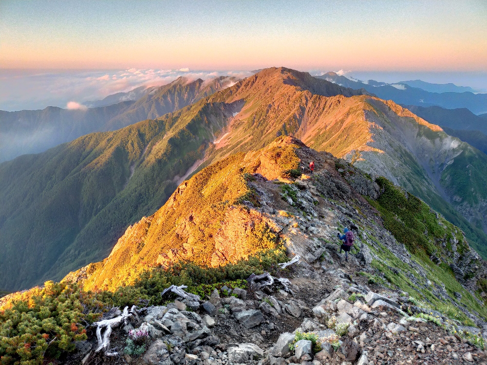 <概要>南アルプス夏山縦走。3000mの峰々をつなぐ縦走路に挑戦。幕営、岩の急登、白樺の森、急速に発達する雷雲、避難小屋泊、山の玄人達、虹、ガスと青空、雷鳥の親子、天空の稜線、山小屋のカレー、キタダケソウなどの高山植物、ご来光、モルゲンロート、ブロッケン現象、雪渓、豊富な沢の水。3泊4日の行程は、いろいろな体験ができた!