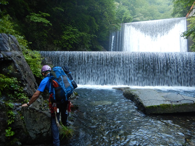 入山当日、銀山平にある国民宿舎を早朝に出発。林道のゲート手前で庚申川に下りて入渓しました。しばらく浅いゴルジュ帯を進むと2段の大堰堤。1時間かけて鷹巻きました。