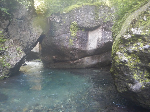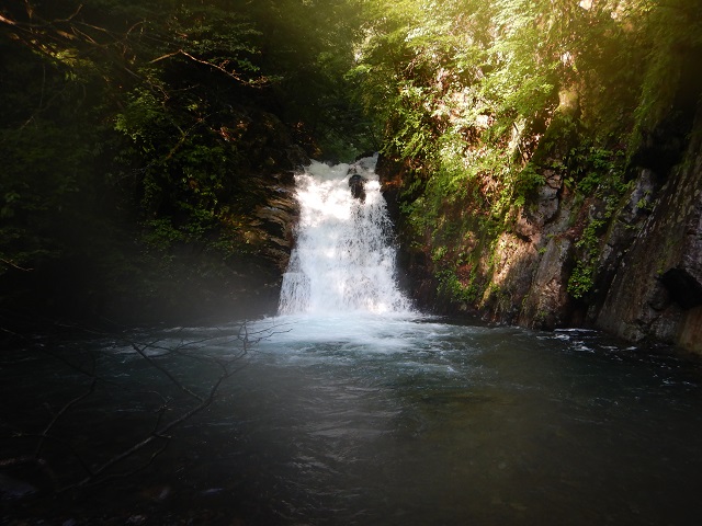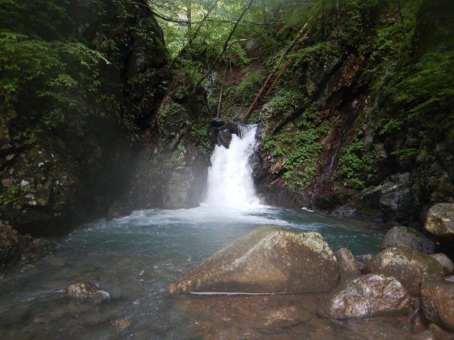 しばらく大きなゴーロを進む。10Mくらいの水量の多い滝と釜が現れました。これが工夫の滝か?直登をあきらめ高巻く。この先、滝らしい滝が現れず大きなゴーロ帯と水量の多いゴルジュに苦戦する。出発から3時間ほどで笹ミキ沢出合を通過。休憩ごとにありさかさんが竿を出すも手ごたえ無し。この先もゴルジュは続く。水ノ面沢出合から並行していた林道と別れて、本流を進みました。