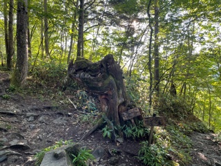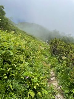 ここから暫く高齢の男性登山者(日帰りピストン)1名の方と抜きつ抜かれつで歩く。登山口から40分程は沢筋を歩くので気持ちが良かった。力水で水筒に満杯の水を入れた。(この水でコーヒーとカップ麺を作る為)ここから登りが始まるが、最初の階段の始まりだ。登山口から1時間程で、木々の合間から常念岳が見え始めた。常念岳を眺めながら次女を連れて歩いた常念岳山行を懐かしく思い出した。まめうち平で小休止、特大の梅干が美味しかった。早朝で蒸し暑さがなかったので、蝶沢手前までの樹林帯歩きがとても気持ち良かった。常念岳方面は青空だが蝶ヶ岳方面は雲の中だ。途中下山中の方が、蝶ヶ岳頂上は晴れていて素晴らしい展望ですと教えてくれたので嬉しくなった。