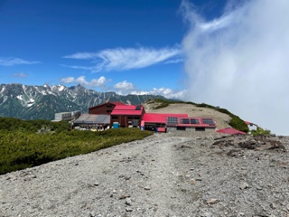 10:00頃にテント場に着くと若者がテントを設営していた。テン場からヒュッテの見える下りから西方に雄大な穂高の山並みが見えた。