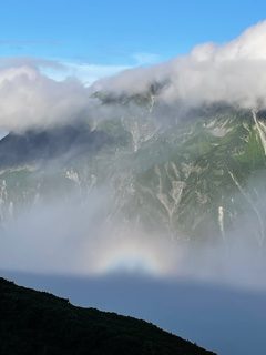 朝食を済ませ小屋を出発した。妖精の池方面に下る途中、穂高方面にうっすらとブロッケン現象が見られた。ドイツのブロッケン山でよく見られることから「ブロッケン現象」と名づけられたそうだ。今回楽しみにしていた妖精の池、周辺のお花畑で至福の一時を過ごし満足だった。
