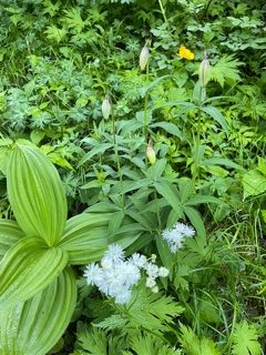 2140mの蝶沢辺りから可憐な花が見られるようになる。この先2時間半の間は高山植物の写真撮りを楽しみながらゆっくりと歩いた。大滝山分岐で、お花畑を見るために大滝山方面に少し下った。コバイケイソウの群落があり綺麗だった。どこの山も今年はコバイケイソウの当たり年のようだ。