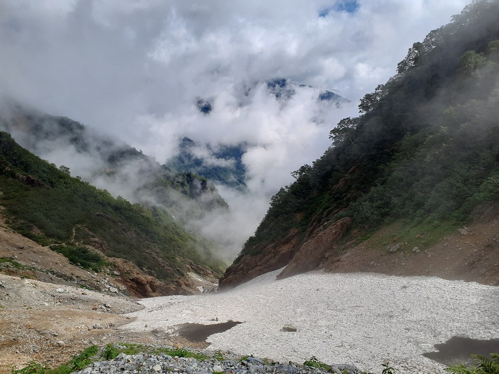 2時間半で針ノ木雪渓が現れる。雪渓は崩れかけているので、高巻きのルートで指示されていた。このルートが危険であった。