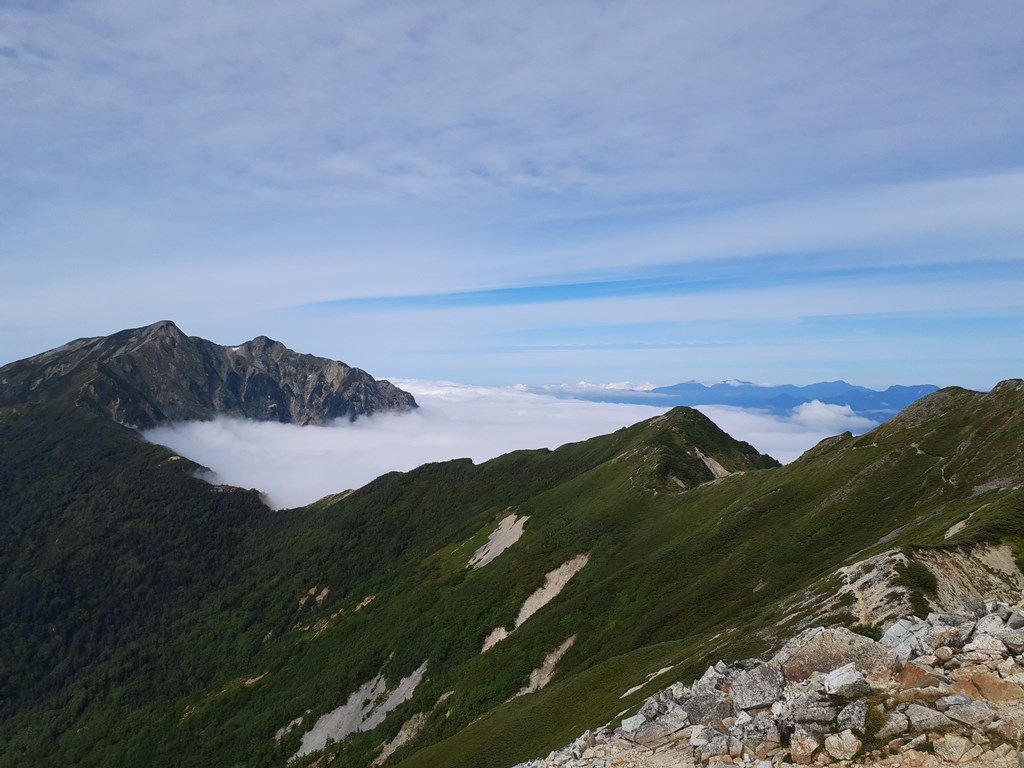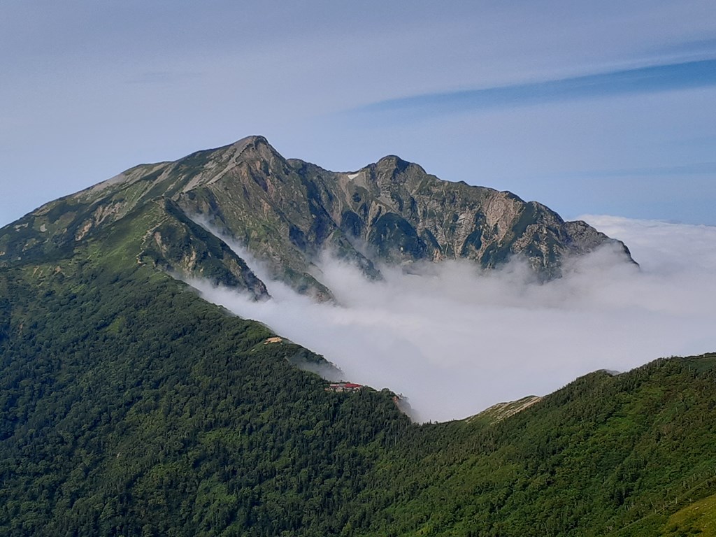 荷物をおいて蓮華岳を往復。気持ちの良い稜線歩き。明日の目的地種池山荘が見えた