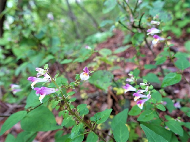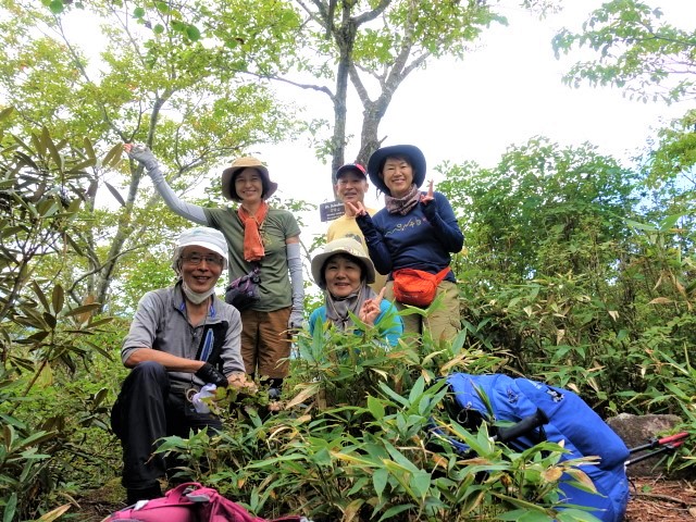 植林地のジグを切りながら高度を上げると、やがて送電線着、ここからはややルートが狭くなり登山道らしくなる。気温は20℃程度だが汗はかく。女性が多いと賑やかでクマ鈴要らず? 日頃のウップンを吐き出すオシャベリが続く。コロナ巣ごもり対策にはうってつけだ。大岩までは結構大変だった。全員が初めてのコース、大岩を越えるのに少し心配もあったが、ふみ跡に従い左側から、ロープと木の根を掴み登れば問題なし、大岩の上で若干景観が出てくるが、高原の稜線だけで、あとは樹々に阻まれる。