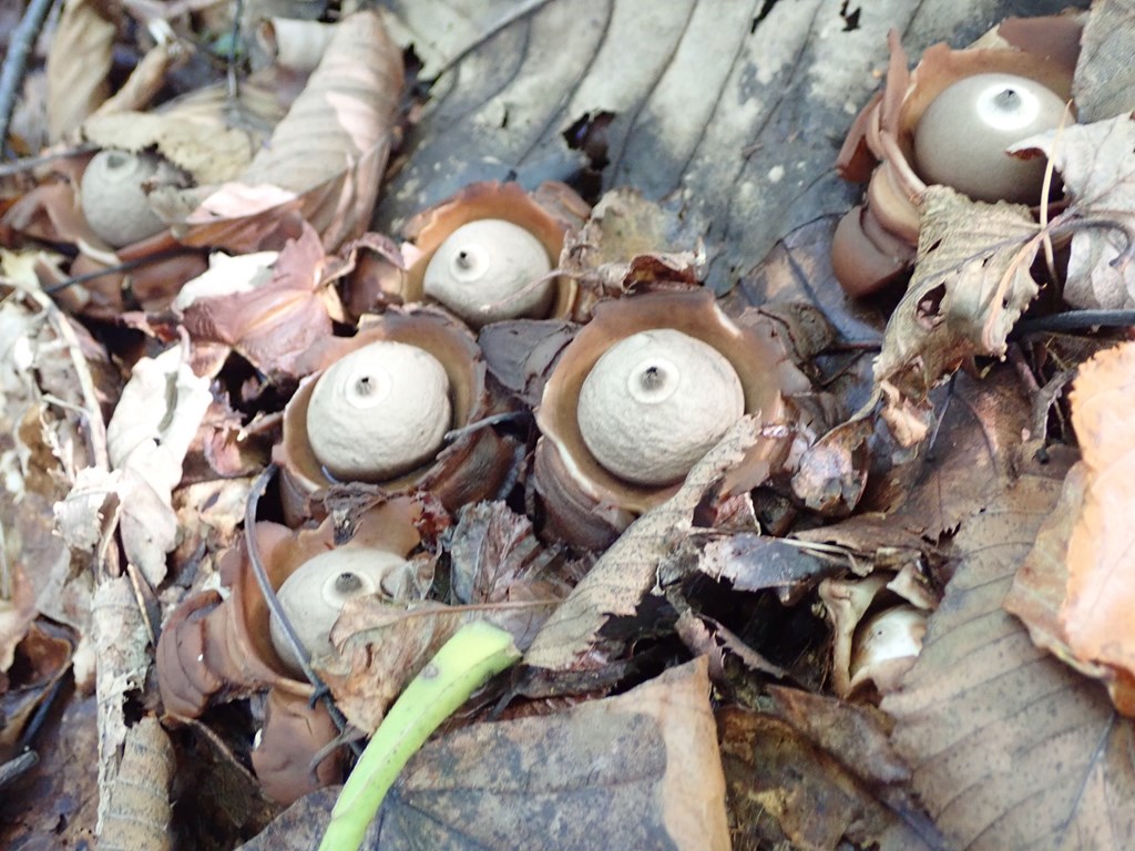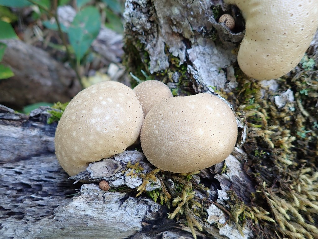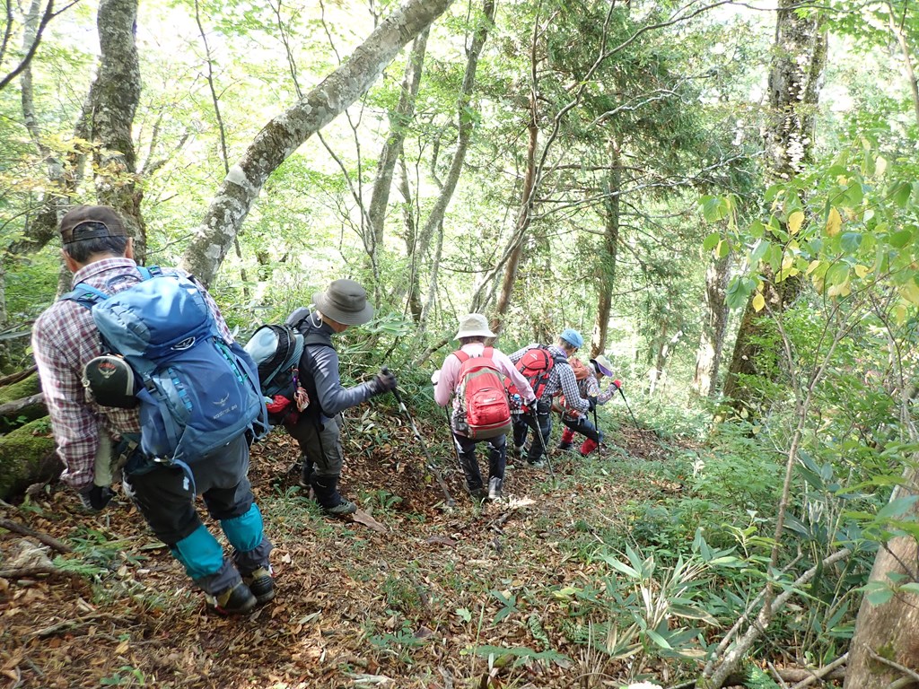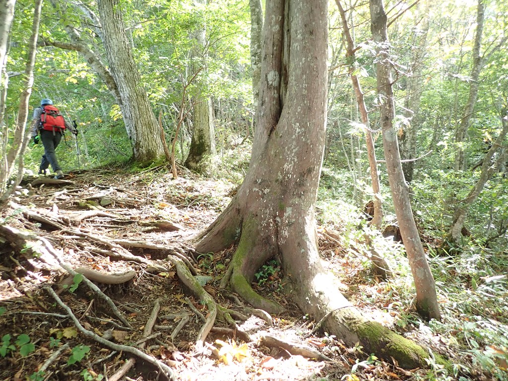 駐車地から林道を少し戻って、博士山登山口の標識から登山道に入る。シダの多い沢沿いの道を登ると、北方向に延びる尾根に乗った。少し尾根を登るとたくさん山栗が落ちていた。数日前の台風の影響でイガが落ちたようだ。全員、栗拾いに夢中になった。もう少し登ると様々なキノコが顔を出してきたが名前は分からないものが多い。おまけに少し腐りかけて気味が悪いものもある。尾根にはブナが増えてきて、大木も見られた。休みながらゆっくりと登っていくと次第に傾斜がきつくなった。そこでOさんの登山靴のソールがはがれた。メンバーの持っていた結束バンドと私が持っていたダクトテープで固定した。私は登山を始めた時から入門書に書かれていたダクトテープを山に携帯するようにしているが、役に立ったのは今回が初めてだ。下山するまで何とか持ちこたえることができた。標高が上がるとアスナロの大木が見られるようになった。