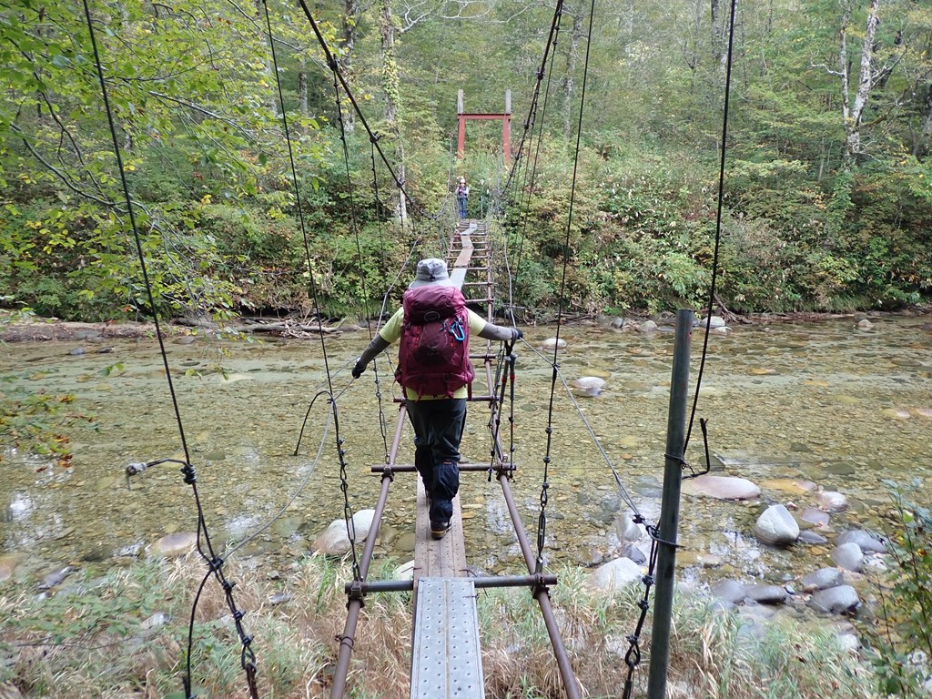 このルートは荒川に架かる吊橋から始まる。橋の踏み場所は幅約20cmの鉄板だけで、揺れると心許ない事限りない。ただ、高度が3mぐらいで、下の流れは砂利のせせらぎなので、落ちても怪我はしないだろうと思うと、高所恐怖症の私でも問題なく渡ることができた。ただ、風が強いとかなり揺れそうだ。ちなみに、下の流れは、靴を脱げば簡単に渡渉できそうに見えた。