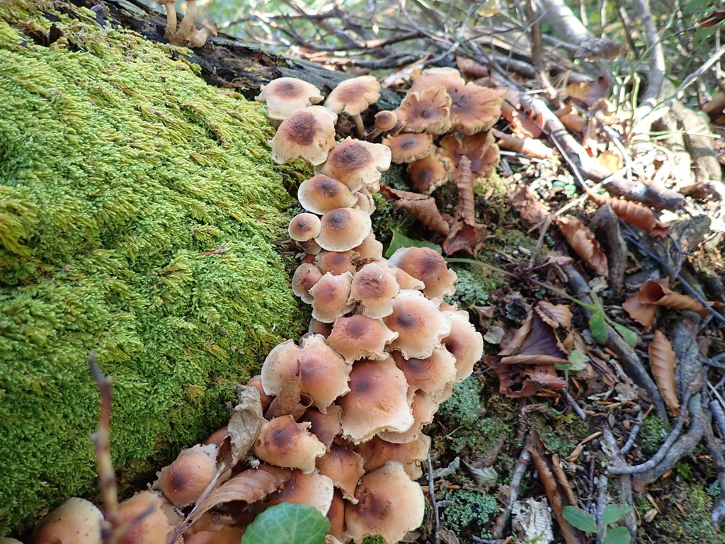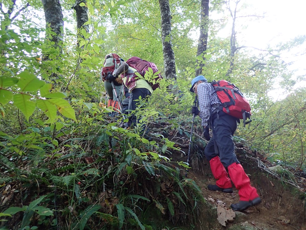 尾根は、傾斜の緩やかな場所もあるが概ね急登だ。時々休憩を取りながらゆっくりと進む。1068mへの登りで、枯れた大木の根元にクリタケが群生していたがすでに傷み始めていた。1068m地点辺りから大木が減って、登山道周辺は灌木とササが増えてきた。そして、灌木は少しづつ紅葉し始めていた。