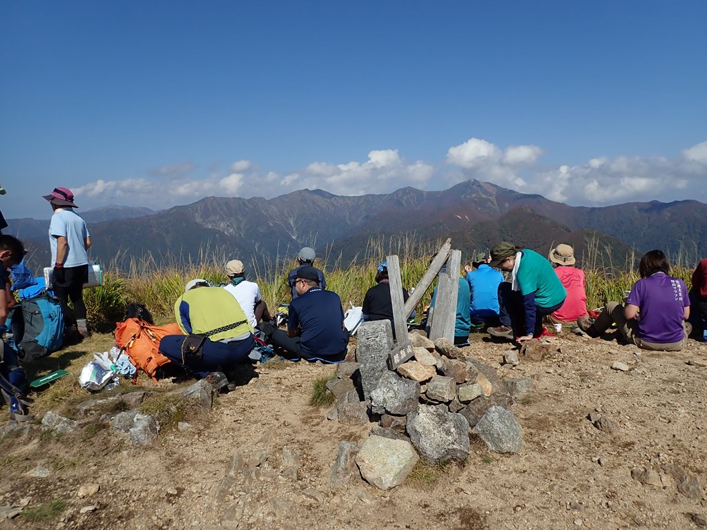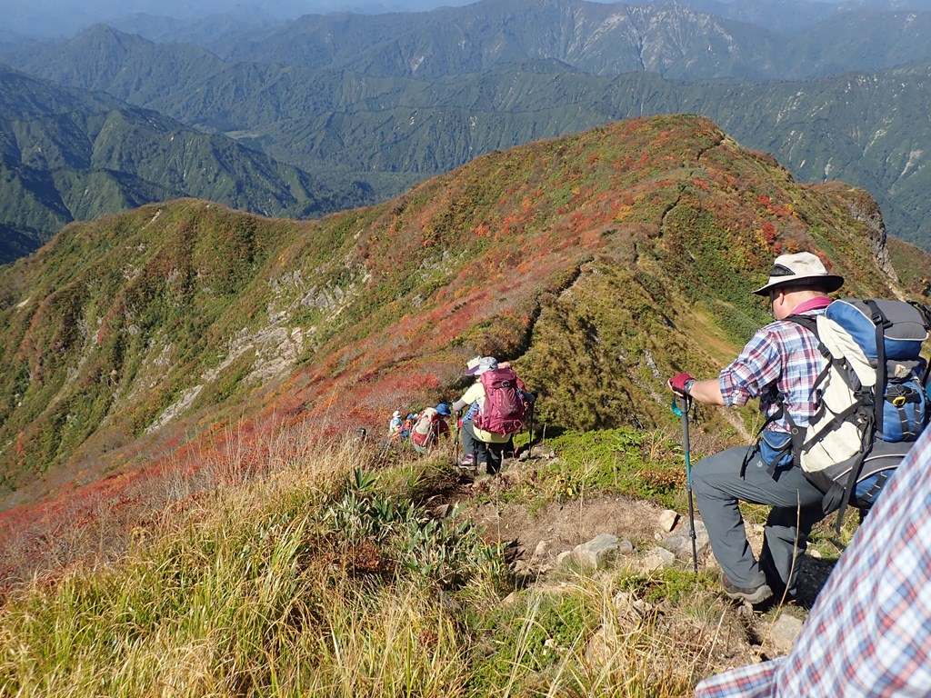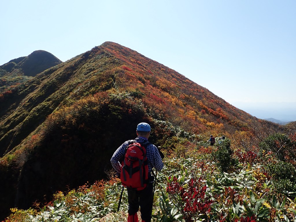 標高1239m地点は岩のピークで眺望がすばらしい。そこから上は紅葉の見頃だった。標識には「一の塔」と書かれていたが、「2の塔」「3の塔」は確認できなかった。そこから先は左手が崖で、ほぼ絶壁のように見える。ストックのゴムを外した。絶対に左に転倒したくない。前方にやっと祝瓶山が見えてきた。今までは手前の山が邪魔をして見えなかったのだ。マッターホルンというが、ここまで登ると山頂は丸く見える。手前のピークは北側をトラバースして途中に朝日連峰への分岐がある。今日もかなりの登山者がその方面へ向かったのだろう。駐車場が満杯の割には下山していく人が少ないのでかなりの人が朝日へ向かったものと思われる。最後の急登を這い上って山頂に着いた。360度遮るものの無い見事な眺望だ。すでに5-6名の登山者が休んでいた。少しすると、20名ぐらいのグループがやってきて山頂は一気に賑やかになった。