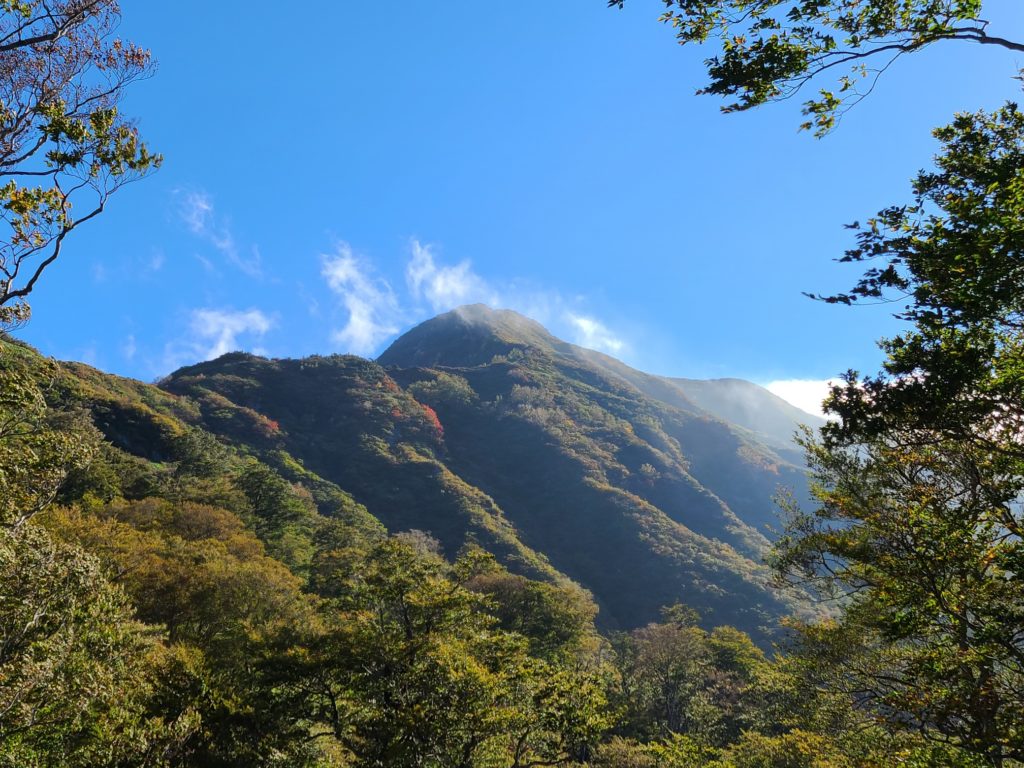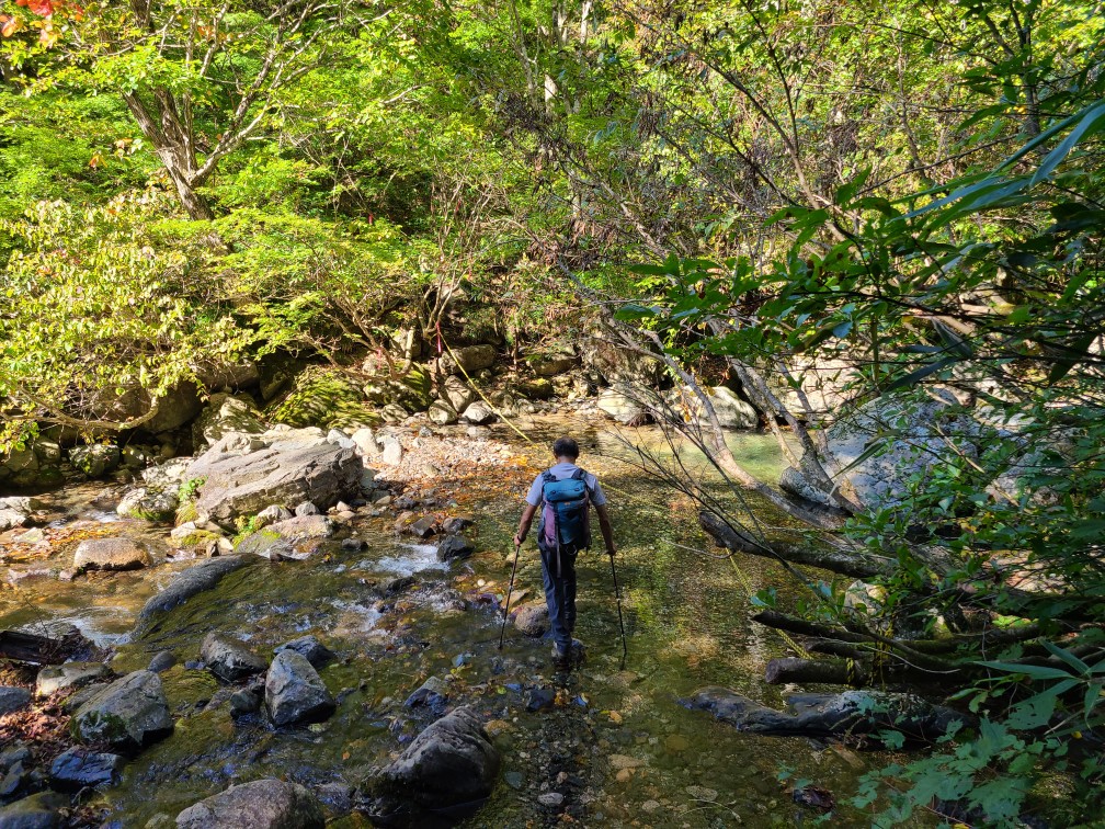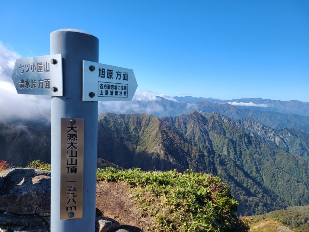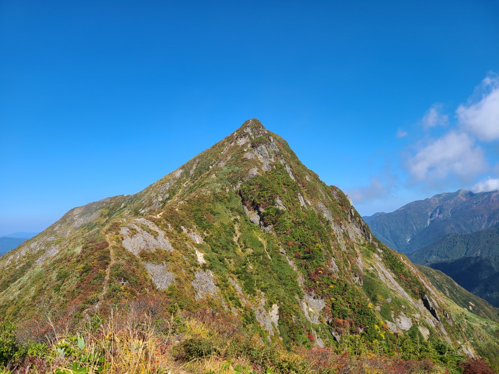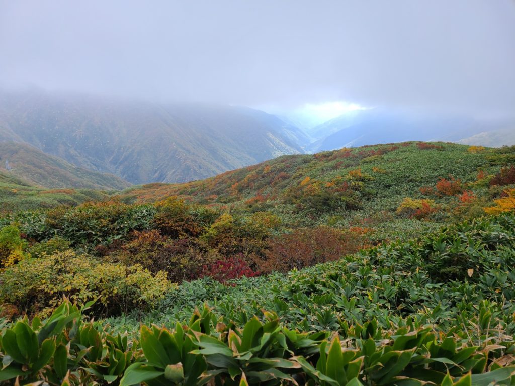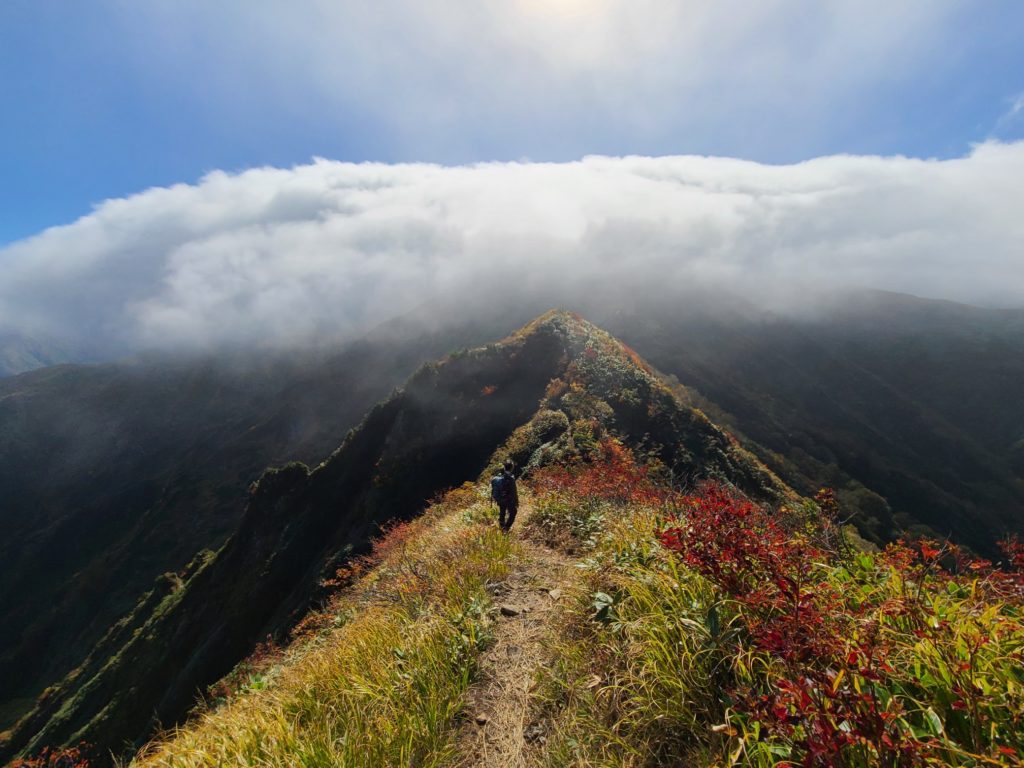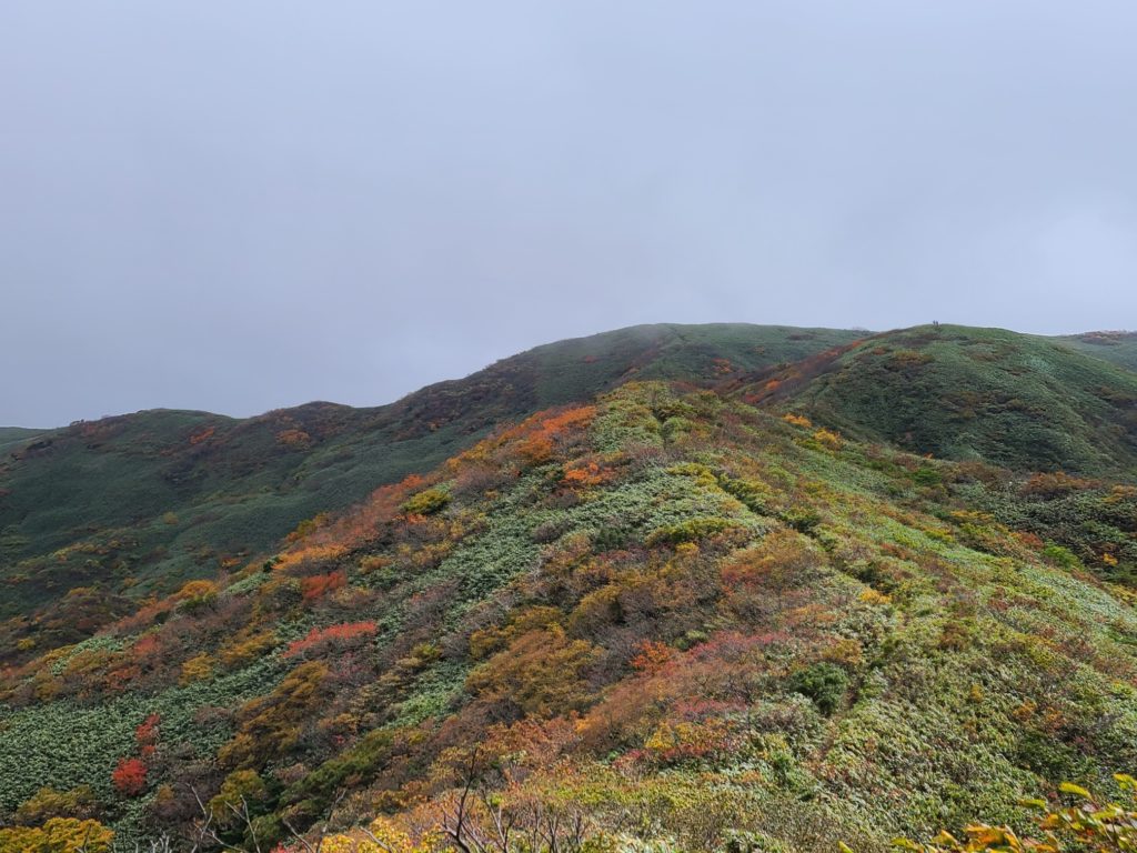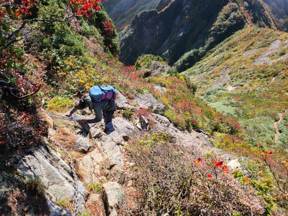 6時半過ぎに駐車場に着くと駐車場はいっぱいで路駐もあり。何とか路肩に停められた。まずは大源太山を目指す。2つ目の渡渉、今回は慎重に通過、そこからは泥交じりの滑る急登をひたすら我慢して登る。色づく木々の中を登り森林限界に出ると強風にあおられ、何度か耐風姿勢を取った。岩場や痩せ尾根で風にあおられてとても怖い思いをした。2時間ほどで山頂に着く。前の週槍ヶ岳に登ったので今回の急登は少し楽に感じた。山頂は私たちを含め6人。そこでは少し景色を眺め先を急いだ。山頂からの下りは50メートルほどの岩場でストックをしまい下りた。ここも前触れは大変とあったが槍ヶ岳と比べればなんてことはない。鞍部に下り振り返ると色づいた上越のマッターホルンの雄姿がかっこいい。七ツ小屋山への登り返しはガスがかかりまさに突入していく感じだ。稜線は強風とガス真っ白の世界。一瞬青空が広がり朝日岳土合方面が見えた。1時間ほどで1544mの分岐に着いた。ここからは昨年歩いたコース。逆回りで登ってくる登山者とすれ違う。シシゴヤの頭でゆっくり休憩を取り最後の下りが長かった。前回より道が悪路になっていた。馬蹄形の稜線は見られなかったがまずまずの紅葉が見られてよかった。5月は花が見事らしいのでそのころまた訪れたい。