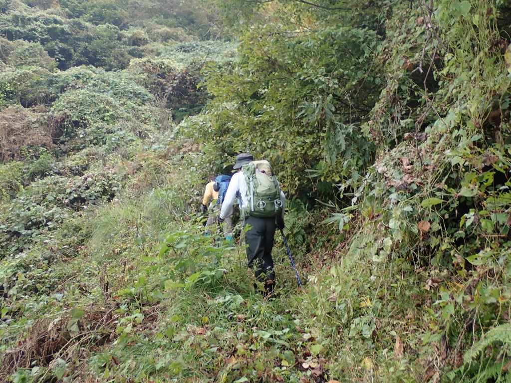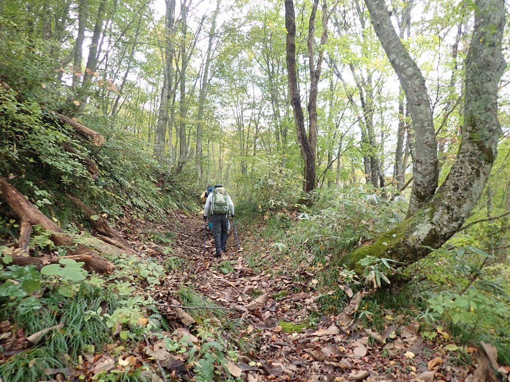 最初に目に付くのは「熊 人身被害発生 多発箇所」の立て看板。今年の5月にも発生したらしい。登山口から西へ植林地の陰気な山道を登る。少し藪っぽいが歩行の邪魔になる程ではない。小さな沢を越えるとジグザグに標高を上げていく。途中一休みした。その先は藪は無くなったが足元は軟弱で歩きづらい。特に標高820m辺りでは足の置き場に困る程だ。だが、その先はブナやミズナラのきれいな森に変わってくる。そして、右奥に明神ヶ岳が見えてきた。