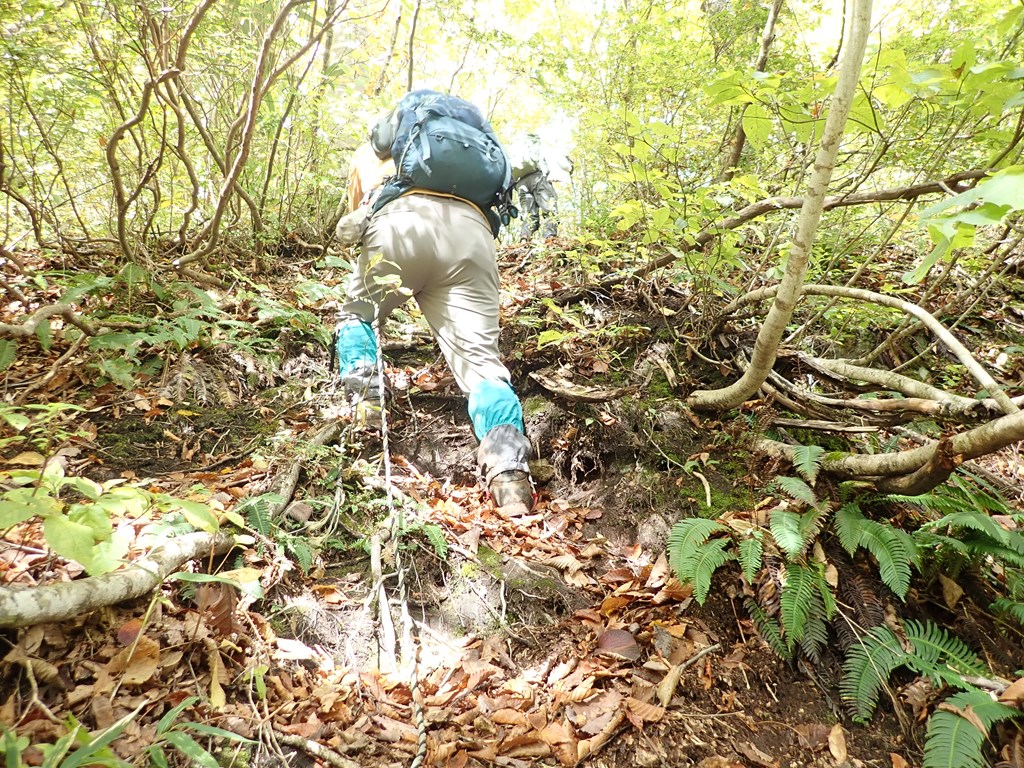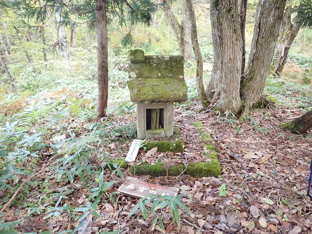 狭間峠は広い峠でどこが峠なのかよくわからない。入口の大木に初めて見る奇妙で大きなキノコ(はしださんの調査によるとミヤマトンビマイタケらしい)があった。ここで下山者に会った。1台先に駐車していた車の主らしい。峠からは歩きやすくなる。標高910mには伊佐須美神社奥宮がある。登山ガイドには赤い鳥居が紹介されているがその鳥居は見えなかった。そこからは少し急登になる。トラロープがあるが、先日の雨で滑りやすくなっていたので慎重に登った。