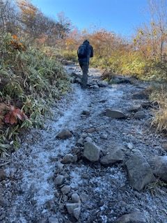 歩き始めの登山道は石がゴロゴロしその上霜がついているのでやや歩きにくかった。