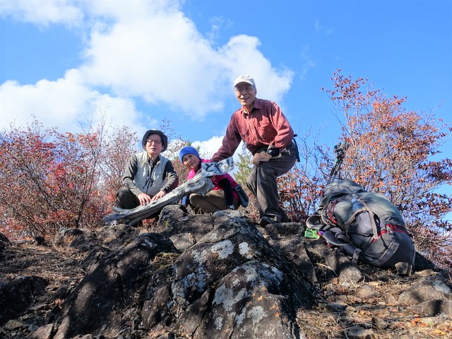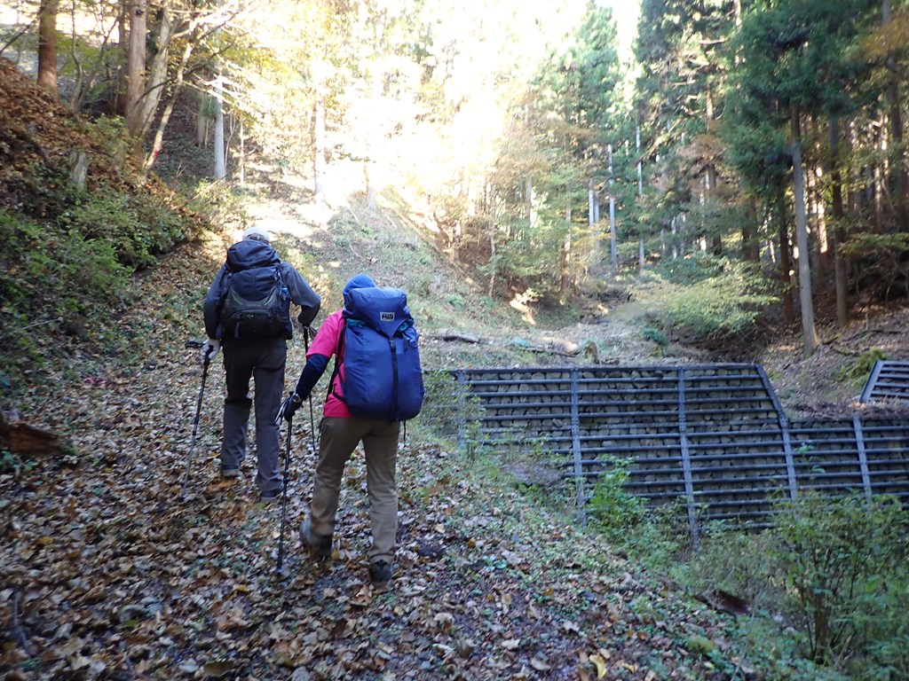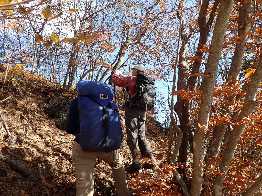 その先でやっと尾根道に出た。紅葉の始まりだ。山道は幅広で歩きやすいが、両側とも急傾斜だ。紅葉は所々でモミジの赤を見るが、枯れた茶色が多いのが残念だった。途中、966mピークを大きく北に巻くのだが、その入口を勘違いして少し進んでしまった。それは、赤ペンキを登山者用のマークと思い込んだからなのだが、そのペンキは林業者のものだったようだ。登山者用にはピンクテープが所々にあった。その巻き道は歩きやすい道なのだが、一部細いトラバースもある。高原分岐に到着。地形図の破線道が交差するところだ。そこからは時々木階段が現れるがその崩壊はかなり進んでいる。