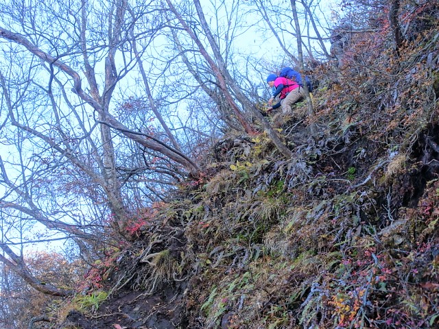 トヤ山への登りは少し難しい場所がある。足元が滑り、ホールドになる筈の切株は浮いている。数分の我慢だが、初心者には確保が必要かもしれない。