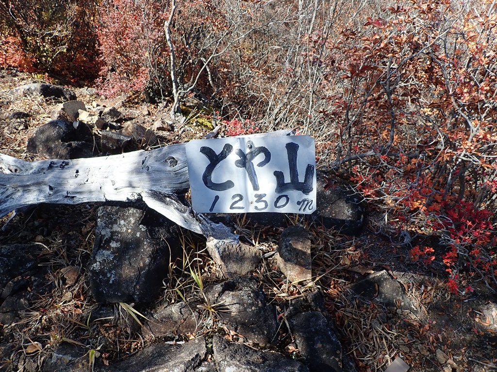 トヤ山山頂に着いた。ブリキ板に「とや山1230m」と書かれていた。山名はひらがななのかも知れない。立木が少し邪魔をするが、山頂からの眺めは良かった。浅間・妙義・西上州南部・両神の山々が眺められた。大休止して下山開始。少し下りた所から、立岩・毛無岩がきれいに見えた。