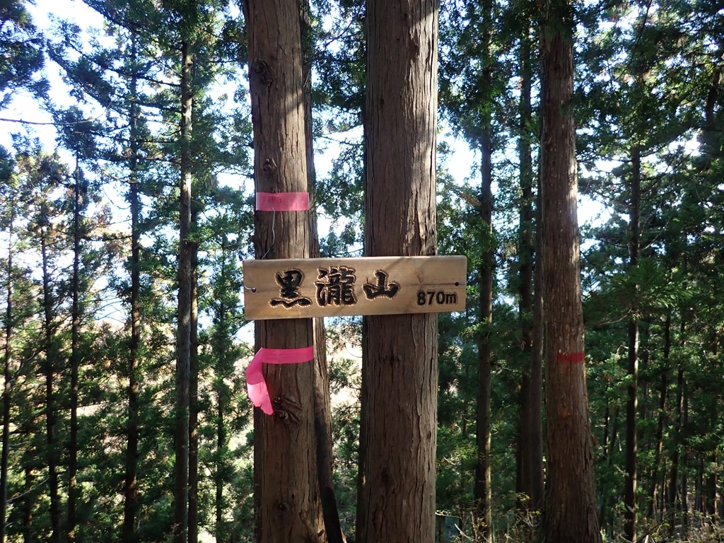 標高870m辺りで黒滝山への尾根に取り付く。約15分で黒滝山山頂に着いたが山名版のみ。眺望無し。早々に退散した。コルまで下るとピンクテープが目に付いたので、そこから林道までショートカット。
