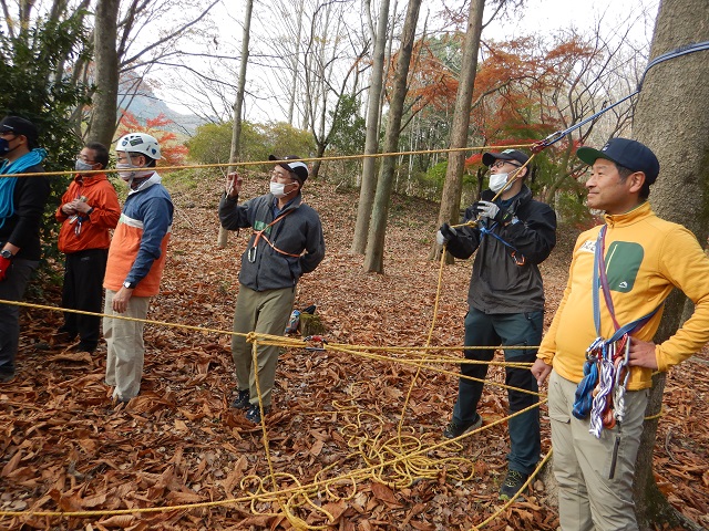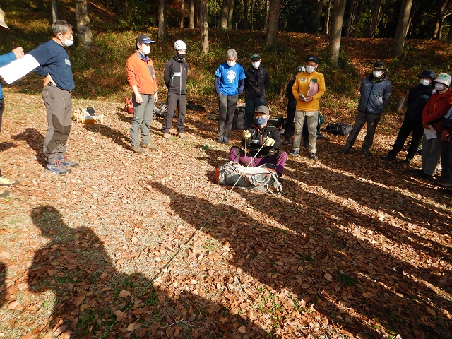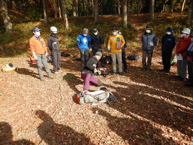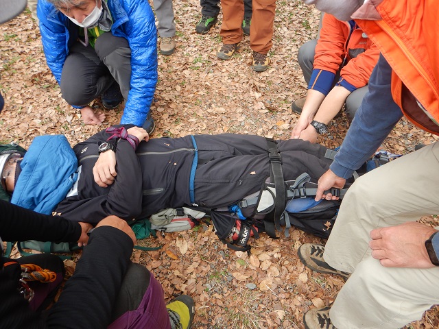 講習の内容として、午前中は一般的な山行時ロープを使って事故を未然に防ぐ方法を学び、午後は縦走中登山道から数メートル転滑落した仲間を救助し、安全な場所へ搬送することを学びました。