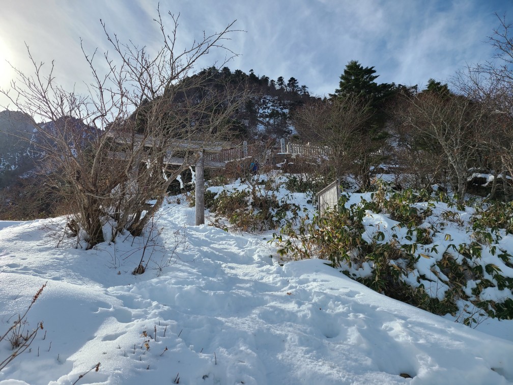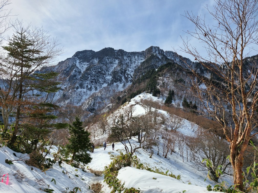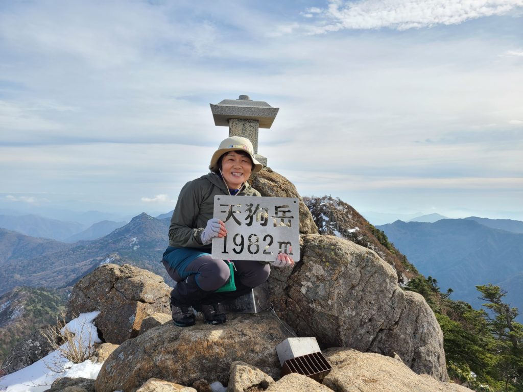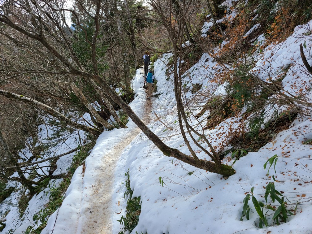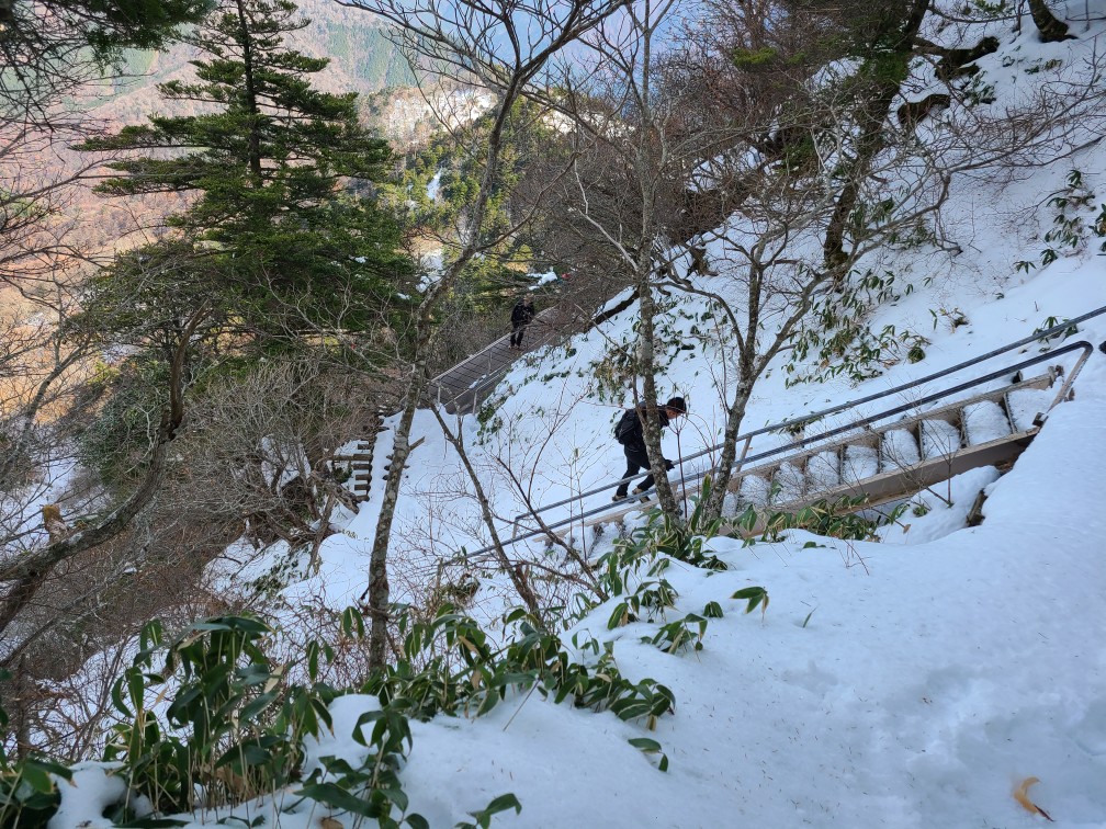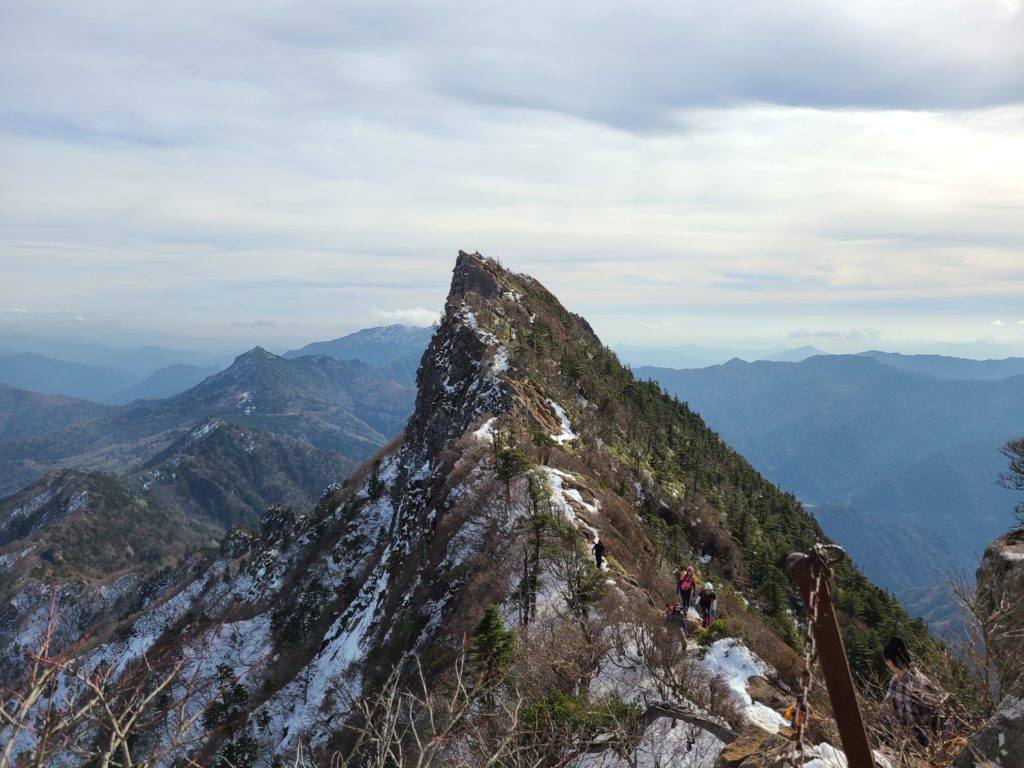 駅前のホテルに宿泊し、朝のバスでロープウエー駅に向かう。登山者10人ほど乗り込んだ。約1時間揺られ到着。約10分ロープウエー成就駅に着き、成就社まで20分歩く。神社で安全登山を祈願し山門をくぐり出発した。整備された歩きやすい八丁坂を下りいよいよ上りになる。間もなく試しの鎖に着くが渋滞していたので左にまくと雪が出てきた。まだアイゼンを履くほどではないのでそのまま進む。普通の散歩靴にストックもないおじいさんがつるんコつるんコ滑りながら登っていて、ここからはずっと雪だからやめた方がいいと助言する。雪が途切れなくなったあたりでアイゼンを着けた。夜明け峠着くと天狗岳の北壁が目の前にドーン。気持ちの良い風景が広がる。右手には瀬戸内海も見える。一の鎖二の鎖三の鎖は雪に埋もれていて巻き道を行くが、鉄の階段があり、アイゼンが引っ掛かって歩きづらい。尾根に上がるとすぐ弥山の山頂に着いた。大勢の人が休んでいて、天狗岳へ向かっている人もたくさんいる。悩んだがせっかくなので行くことにした。8本のアイゼンを履いて岩場を下りたり通過するのは難儀だったので途中で外したら歩きやすい。最初から外していけばよかった。雪もあったが腐っていたのでアイゼンはなくても問題なかった。写真を撮ってもらい弥山に戻りお昼を食べて急いで下山開始。夕方四国中央に住む別の友達と会う約束をしていて15:17のバスに乗らなければならない。快調に飛ばし15時のロープウエーに乗りバスにも間に合った。