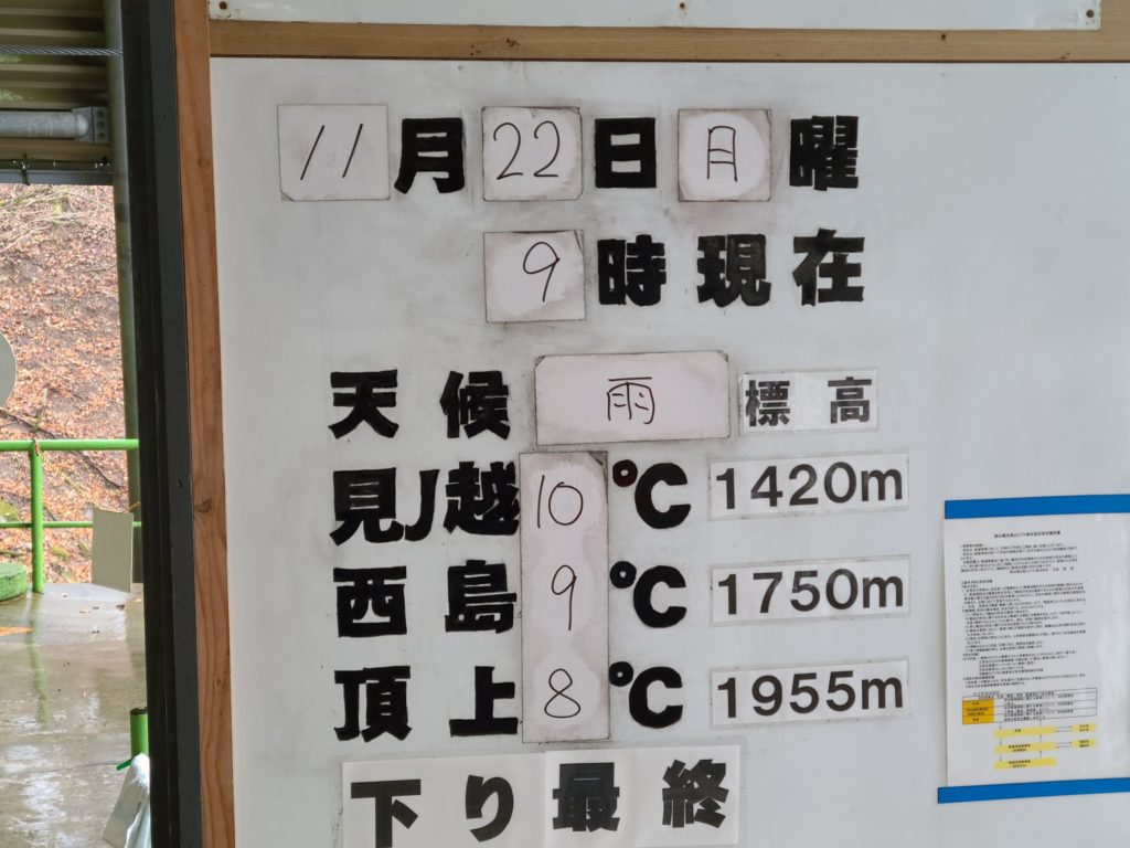 <行程>7:47西条駅前バス停ー8:45石鎚山ロープウエー駅ー9:10山頂成就駅ー9:30神社ー10:35試しの鎖ー10:55夜明け峠ー11:25二の鎖小屋ー11:55山頂ー12:20天狗岳ー12:40弥山お昼13:00ー15:00ロープウェイー15:17バスー16:10西条