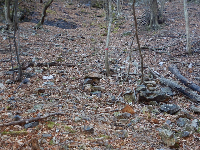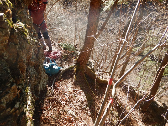 降りた後にしばらく周囲の岩壁を見て歩き、ほかに取付き地点があるか探してみました。すると、取付き地点付近から少し回り込んでみたところに、赤テープが立木に2本巻いてあるところがあり、ここが正規の取付き地点だろうということが分かりました。
