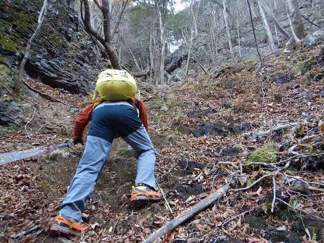 <詳細報告>三段の滝Pに着くとすでに2台の車が駐車中でした。沢と並行してある登山道を進み、三段の滝を通過。三段の滝の落ち口まで上がり、登山道をしばらく進むと左側にケルンと赤テープが巻かれた木がありました。そこが西陵の登り口のようです。落ち葉の急坂を登り詰めると、正面の岩壁付近に踏み跡のようなところがあり、そこが西陵の取付きのようでした。