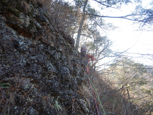 登攀の準備をして、30mの補助ロープをダブルで登りました。取付きを上がると土と岩と藪の登りが待っていました。慣れない藪で苦戦しながら2P目まで進み、3P目で松の木のテラスのようなところに出ました。ですが、ここまで人の歩いた後が全くない。松の木のテラスの先は、垂直のもろい岩に先をふさがれ、ルート探しに時間がたつばかり。冬型の冷たい風にさらされ、ここでギブアップ。立木を支点にして取付き地点まで懸垂で降りました。