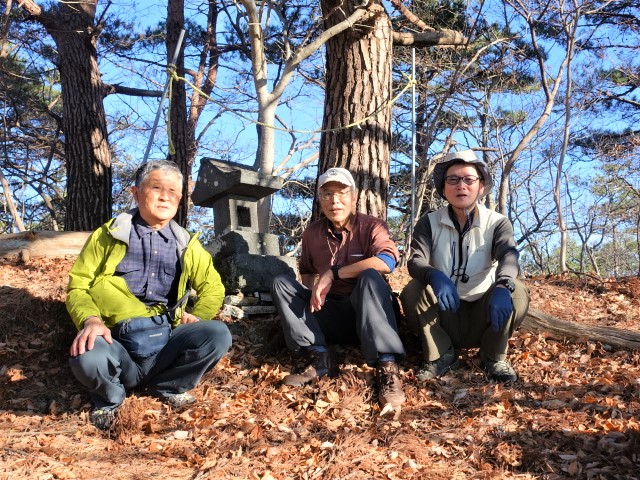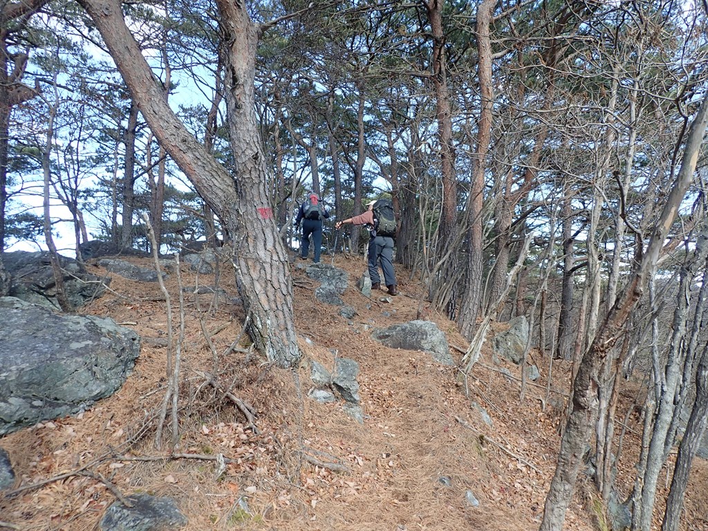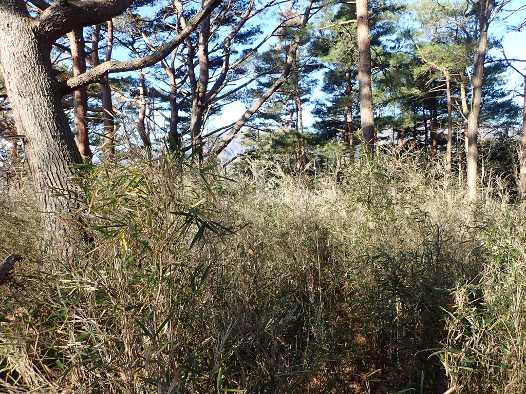 雷電山は標高点605mの南東の小さなピークで祠がある。雷電山までのルートは明確なものは見つからなかったが、ビニールハウスの脇を通らせてもらって斜面に取り付いた。少し藪っぽくて急傾斜だ。私は久しぶりにアプローチシューズを履いていたがそれが落葉で良く滑った。屋根と土台だけになった祠を見てすぐ雷電神社に着いた。ロープで作られた注連縄が残っていたので最近まで祀られているようだ。標高点605mからの下りでは今回のルートで一番の藪に遭遇。篠竹で濃い目だが数分で脱出できた。そこからは踏み跡は薄いが歩きやすい尾根が続く。三角点峰を越え、峠の切通しを過ぎ、ルートが北東から北西に方向を変える地点で大休止した。