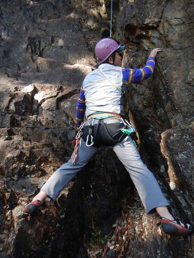 <詳細報告>マルチピッチの練習ができればと、久々に訪れた古賀志山でした。以前リーダー講習会のとき、マルチピッチで登った不動滝左奥フェイス奥のルートに行ってみましたが、ほとんど登られた様子はなく藪化していたため、マルチピッチの練習は諦め、左奥フェイスの3級ルート、クラックルート、エイトルートをトップロープで登り下りしていました。