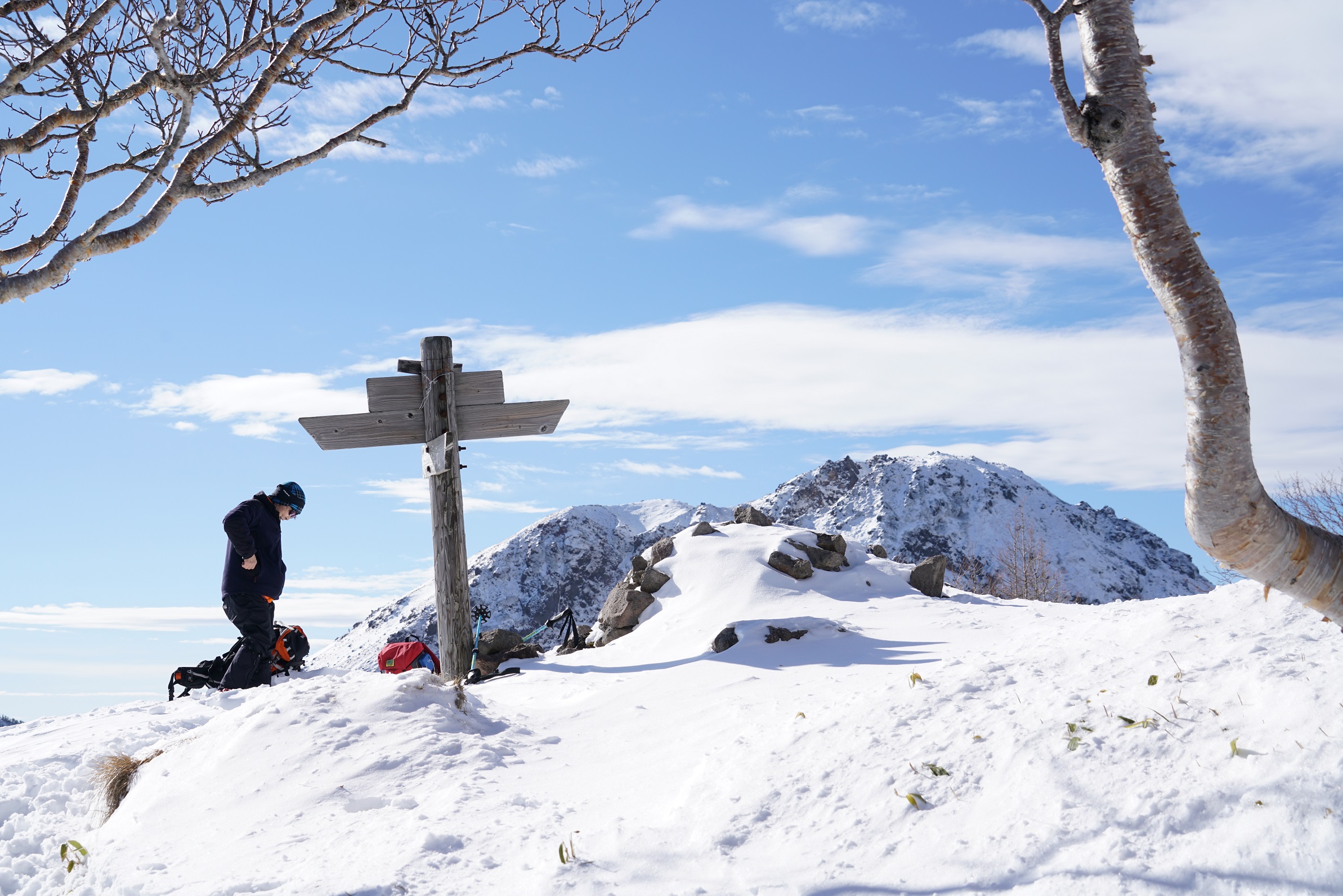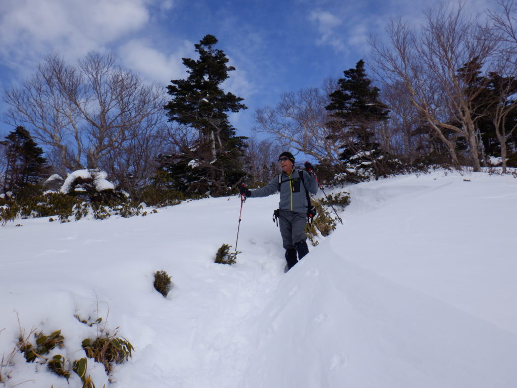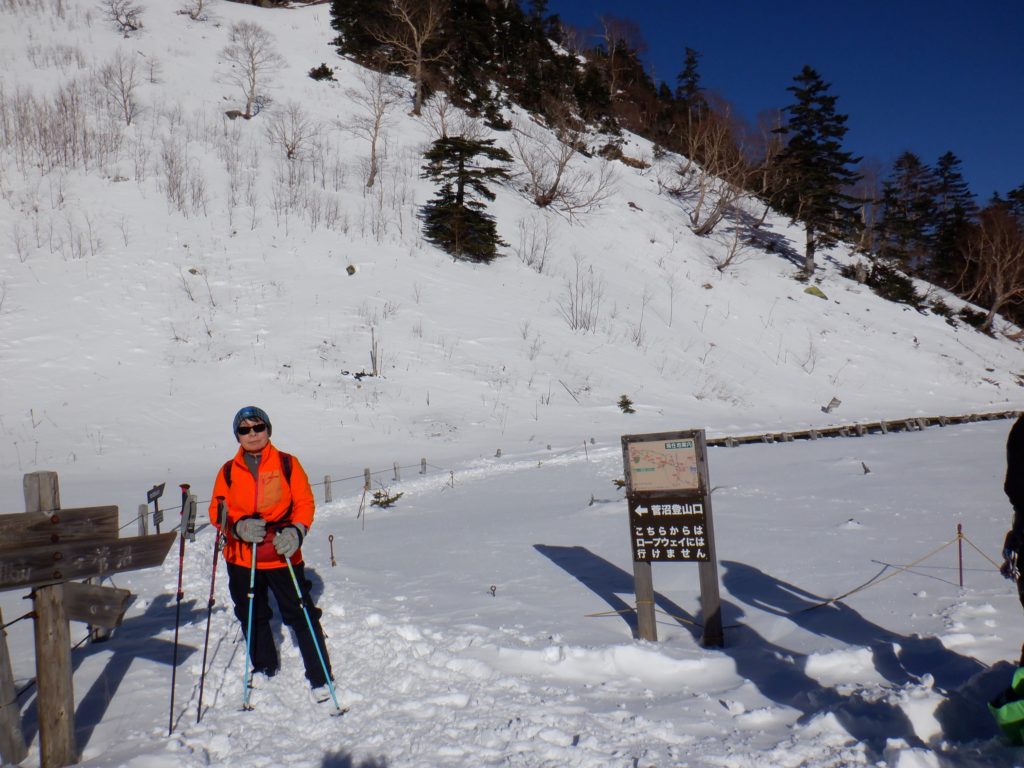 <詳細報告>例年、金精トンネルの閉鎖にあわせて訪れる菅沼口、今回は2週間早いので積雪少なく、駐車場は普段とあまり変わらず、四駆とスタッドレスで奥まで入れた。早朝家を出た割に7時出発は上出来、途中湯元で装備を整え、準備万端で現地到着は正解でした。しかし、久方の雪山は案の定スパッツを付けるのにドタバタでした。今回は久しぶりの雪の上を歩きたい気持ちが強く、奥白根は眼中になく、以前行った五色山に決めました。辺りを見ると宇都宮のYさん達が見えた、声を掛けると会山行で奥白根とのことでした。歩き出して、ここ2年位行った沢通しのルートはまだ雪が少ない様子でした。夏道通しに弥陀ヶ池に向かう。40分位歩きいつもの場所で空腹を満たし9時20分、弥陀ヶ池に着く。ここから五色山に向かう人はいない。池の先から木の柵が露出しており雪が少ないのが分かる。五色沼に下る分岐に着く。ここから池の反対側の斜面にワカンを付けて登りだす、トレースなくワカンが無いと歯が立たない。上部に出ると五色山方面へ平坦な台地を行く、雪にかき消されているがトレースの跡がある。目印の木から急坂を下る、わずかにトレースがあり助かる。鞍部から登り返すと五色沼への分岐に出た。ここからは小さなアップダウンが続く。途中左手から男女のクライマーが現れた、氷登り、雪が相当付いていたとのことでした。途中疲れたのでトップを和代に代わり11時41分、五色山頂に到着した。快晴で眺め良し、少し下った所で食事をとる。国境平方面にトレースがある。下山にかかり、時に薄いがトレースを辿り12時58分五色沼分岐に出た。ここからさらに下り、鞍部からひと頑張りの急坂を登りきると台地に着いた。ここから和代が先行し五色沼下降点に向かう、自分はここから持参した無線機の交信テストを行う。当然ながら声の通りは十分で、安心感は携帯の比ではなく、今後は必要装備と考えたい。弥陀ヶ池付近で男女のペアがクライミングギアを身に付け下山してきた、聞くと奥白根の東稜を登って来たとのこと、13時57分、弥陀ヶ池着。朝会った二人の女性グループに会い声を掛ける。白根、五色沼を経由してきた、風なく寒くなく良かったと喜んでいた。ここから自分はすってんころりんと、2,3回転びながら15時19分駐車場に着きました。ペースが遅いので時間はかかったが、トレースに助けられながらも、頂上を踏んできたので満足でした。